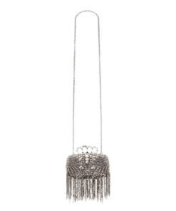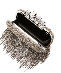 One of the standout features of this bag is its silver-finished handle adorned with punk-inspired rings, adding a unique and rebellious touch to its sophisticated design. The detachable chain strap enhances its versatility, giving you the option to carry it as a clutch or wear it across your body, depending on your style and needs.