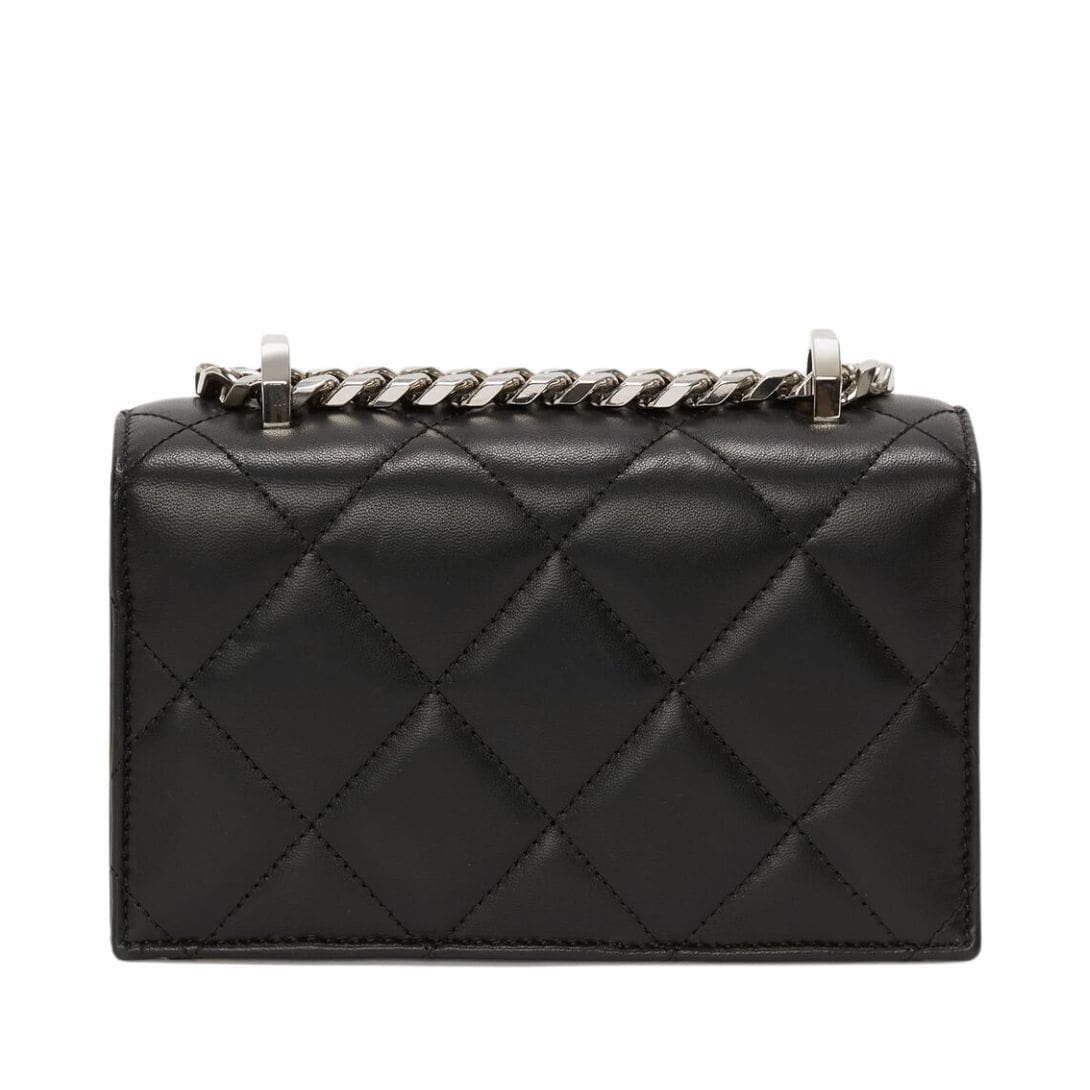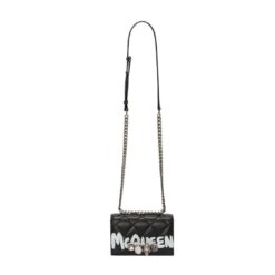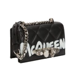 This Alexander Mcqueen Womans Mini Jewelled Satchel In Blackwhite from Italy merges sophistication with practicality in a compact and stylish design. Measuring 17.5 x 9.5 x 4 cm (6.8 x 3.7 x 1.5 inches), it offers ample space for your essentials while maintaining a sleek and elegant profile. The bag features a stunning silver four-ring embellishment encrusted with crystals, adding a touch of glamour and luxury to its appearance.