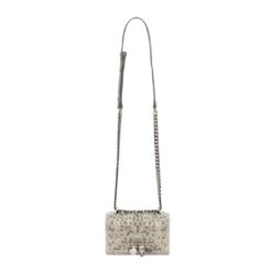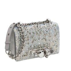 This Alexander Mcqueen Womans Mini Jewelled Satchel In White from Italy merges sophistication with practicality in a compact and stylish design. Measuring 17.5 x 9.5 x 4 cm (6.8 x 3.7 x 1.5 inches), it offers ample space for your essentials while maintaining a sleek and elegant profile. The bag features a stunning silver four-ring embellishment encrusted with crystals, adding a touch of glamour and luxury to its appearance.