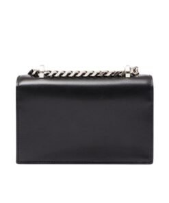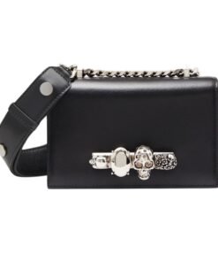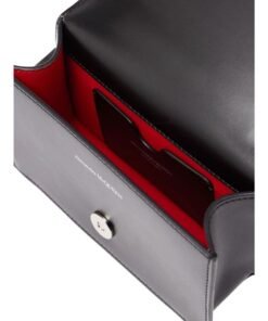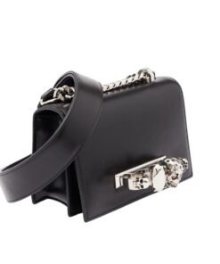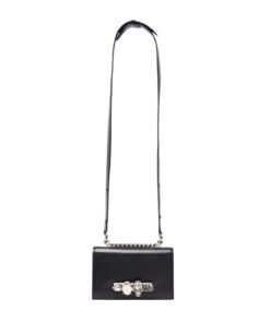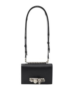 This Alexander Mcqueen Womans The Biker Mini Jewelled Satchel In Black features an antique silver-finished handle adorned with crystal-encrusted rings, blending elegance with a touch of edge. It has one main compartment and a card slot, providing ample space for your essentials. The bag also boasts a biker-inspired adjustable leather strap and brass hardware with an antique silver finish, adding to its unique appeal.