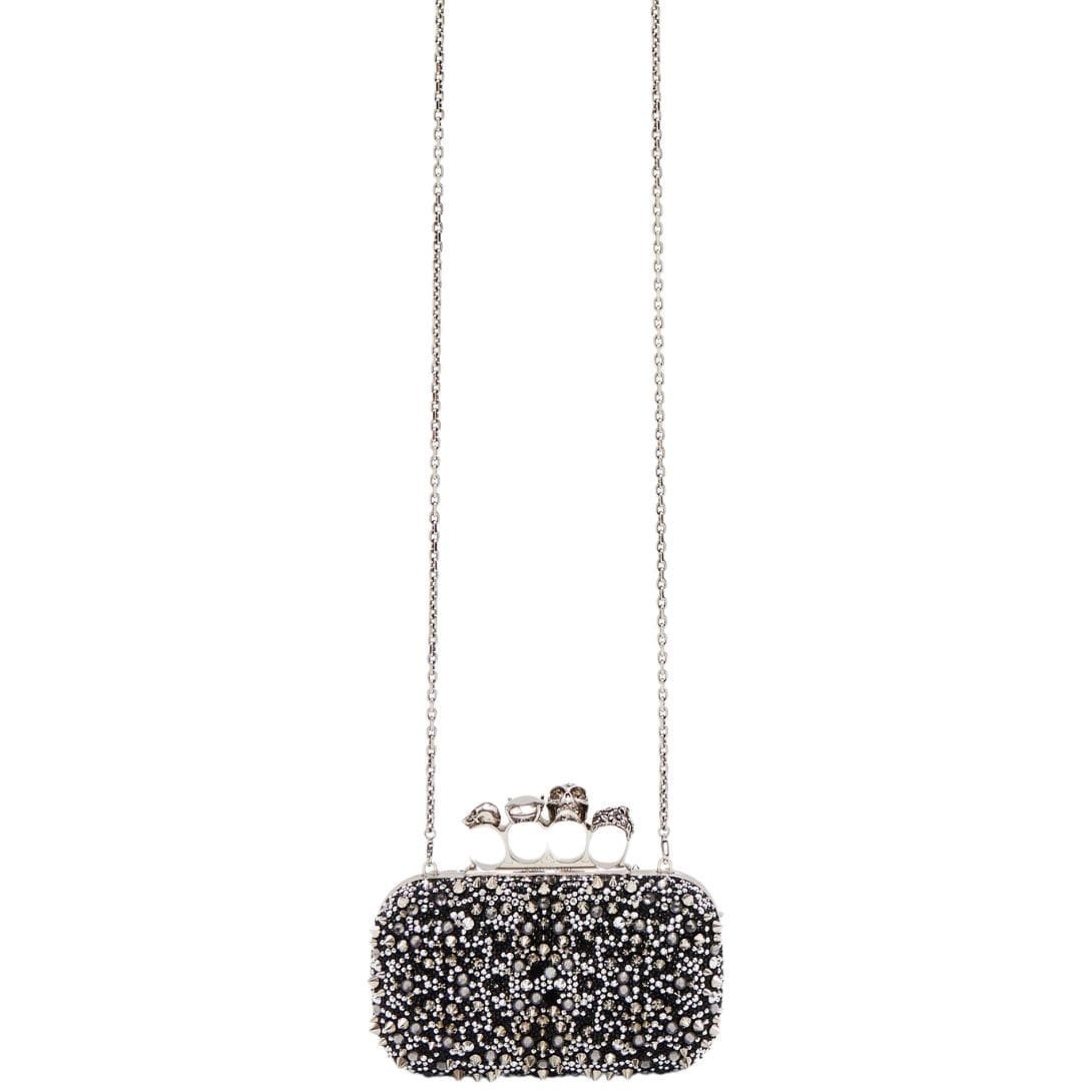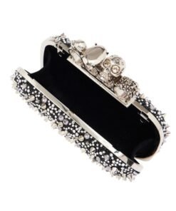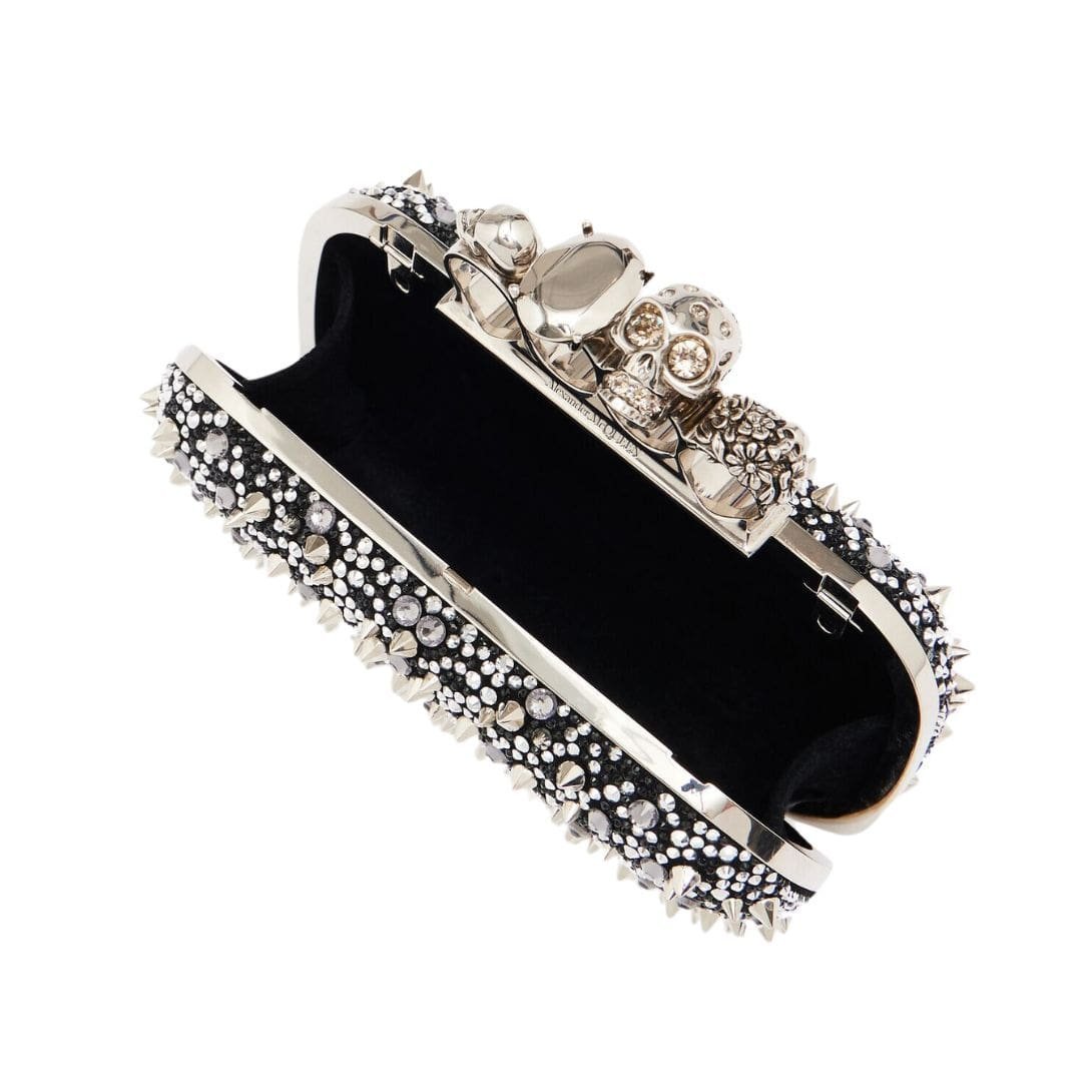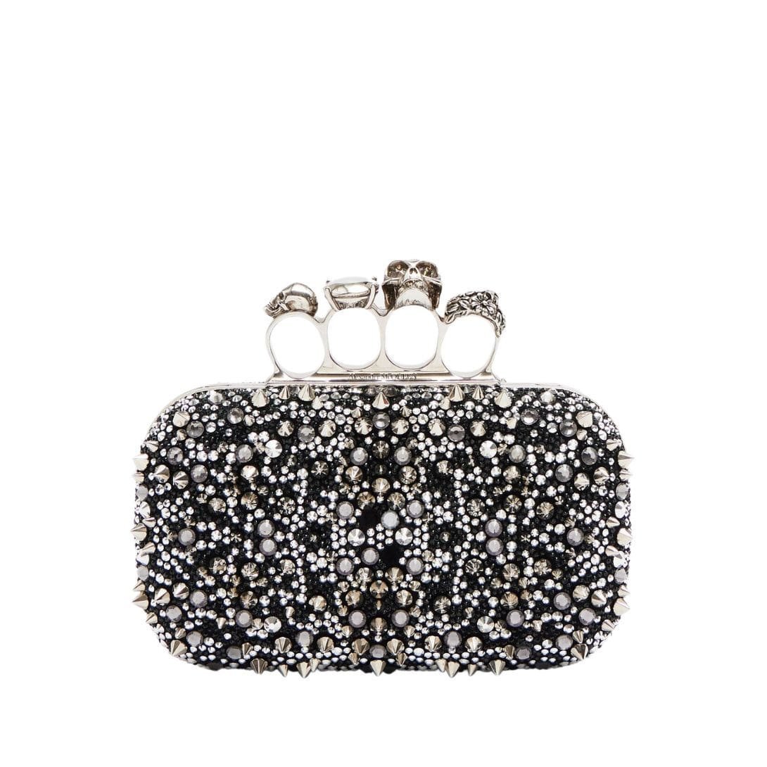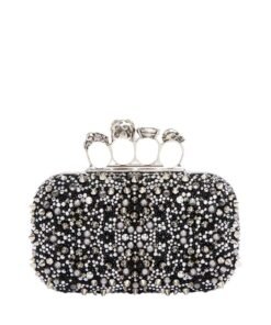 Introducing our Alexander McQueen Women’s Knuckle Clutch in black, a stunning accessory featuring all-over crystal embellishment with a handle adorned with crystal-encrusted rings. This versatile clutch can be worn either hand-held or over the shoulder with its silver-finished chain.