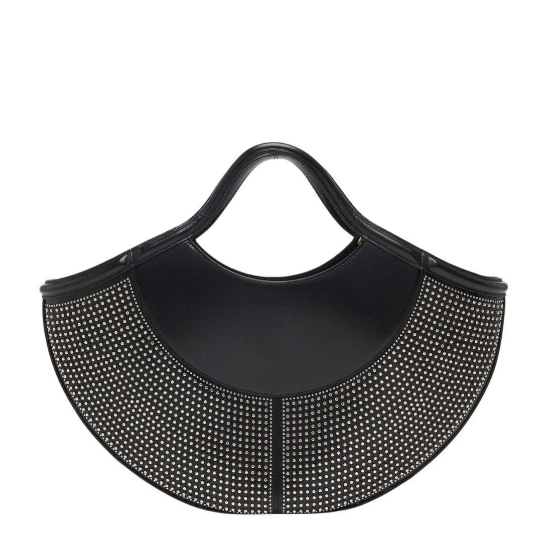 The Alexander McQueen Women’s the Cove bag in black is handcrafted in black calfskin leather with silver-finished studs and internal suede calfskin leather lining. It can be worn over the shoulder using its detachable and adjustable leather strap or hand-held by the top handles.