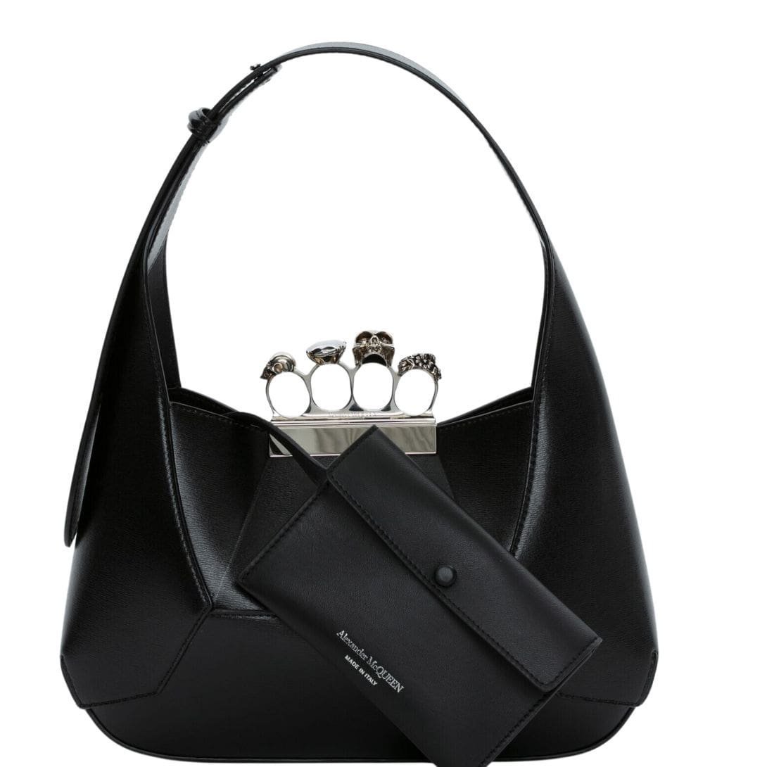 Introducing the Alexander McQueen Women’s the Jewelled Hobo bag in black, crafted from smooth calfskin leather with an antique silver-finished handle adorned with crystal-encrusted rings. Inspired by the faceted stone on the Knuckle, its unique silhouette features leather panels that are intricately cut and re-assembled.