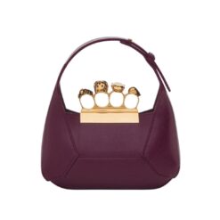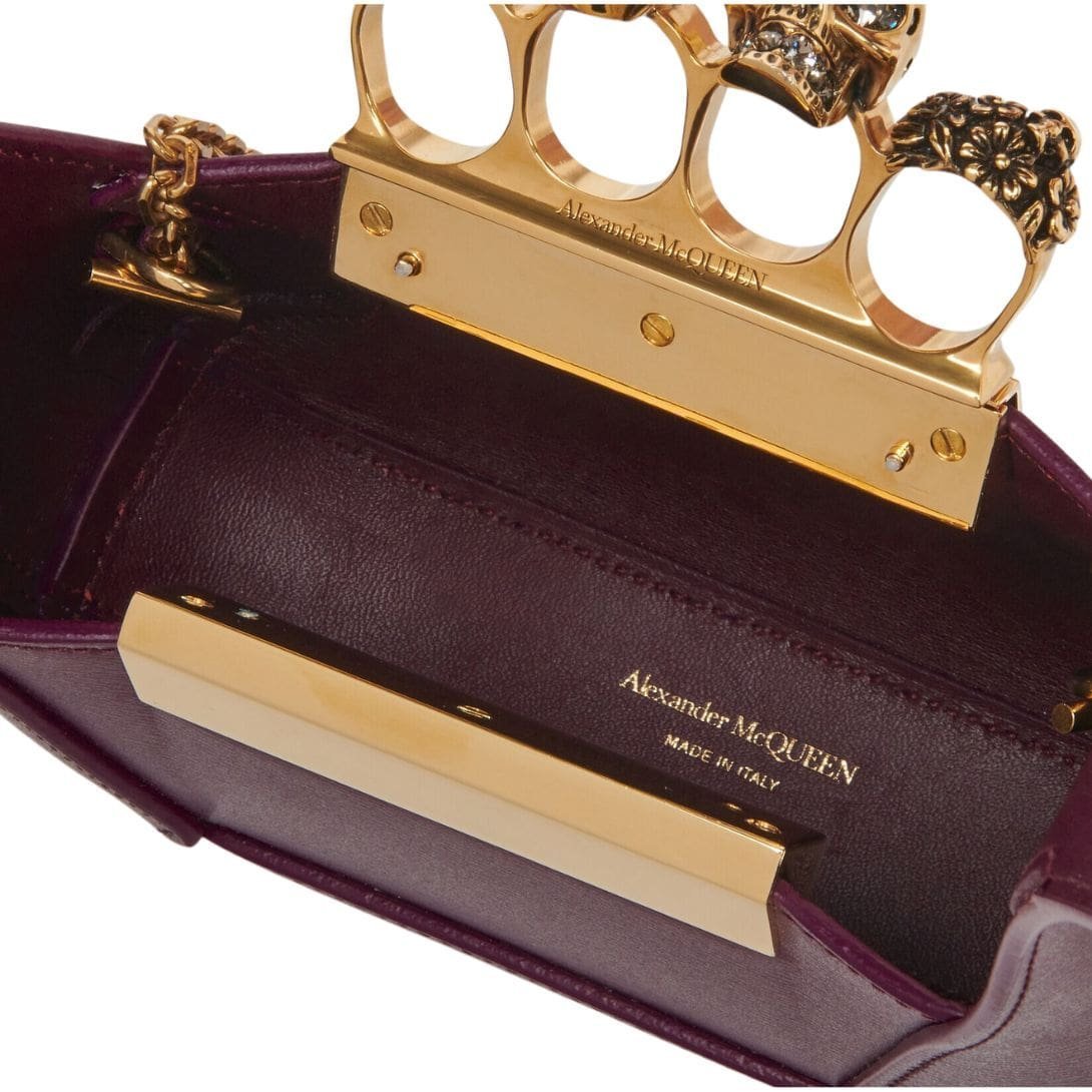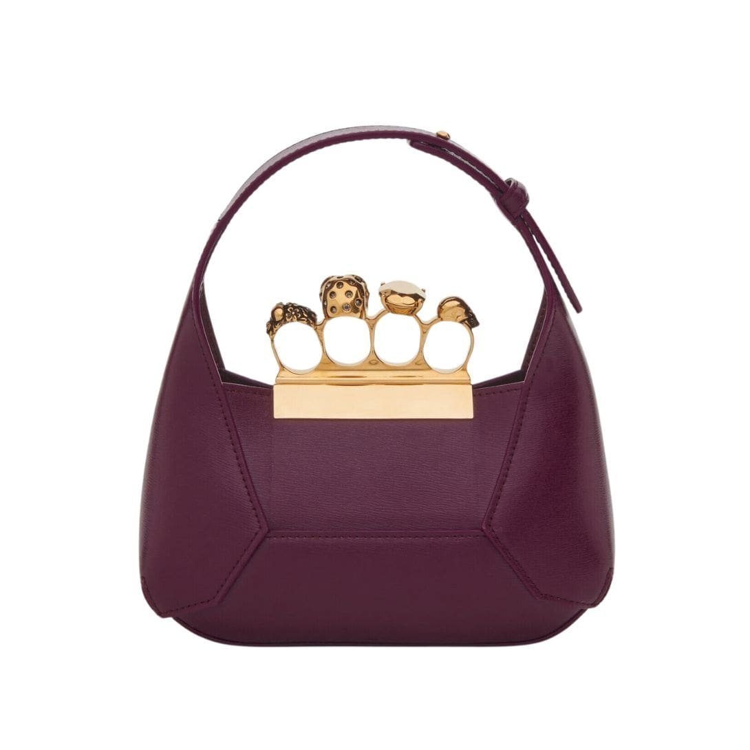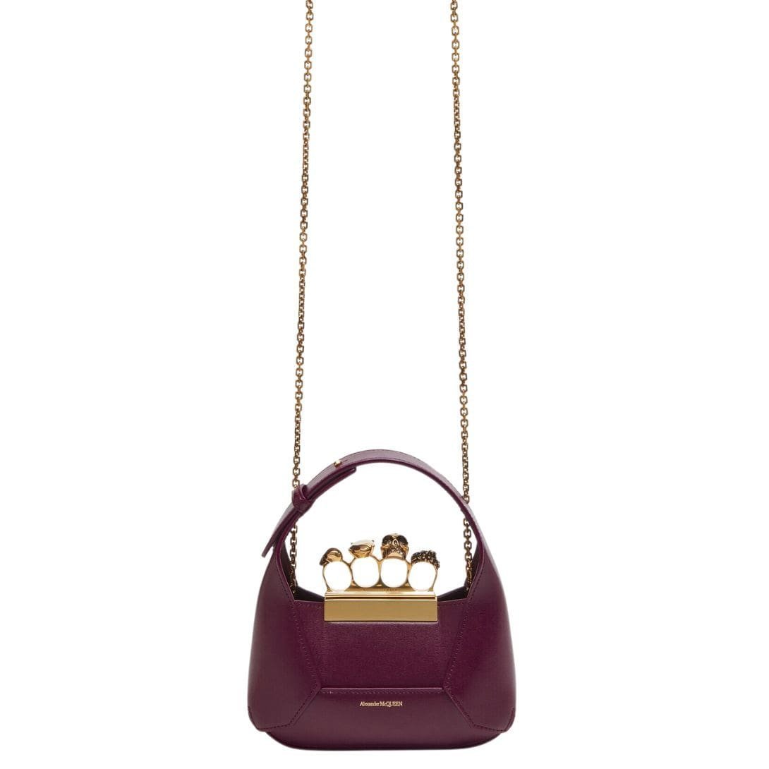 Introducing the Alexander McQueen Womens the jewelled Hobo mini bag in burgundy, crafted from smooth welsh red calfskin leather with an antique silver-finished handle adorned with crystal-encrusted rings. Inspired by the faceted stone on the Knuckle, its unique silhouette features leather panels that are intricately cut and re-assembled.