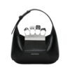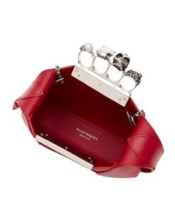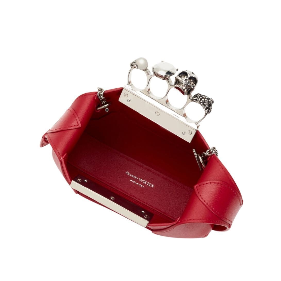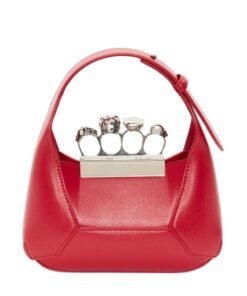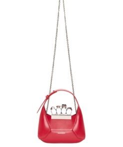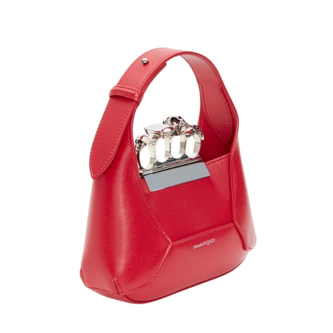 Introducing the Alexander McQueen Women’s the Jewelled Hobo mini bag in welsh red, crafted from smooth welsh red calfskin leather with an antique silver-finished handle adorned with crystal-encrusted rings. Inspired by the faceted stone on the Knuckle, its unique silhouette features leather panels that are intricately cut and re-assembled.