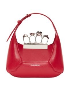 Introducing the Alexander McQueen Women’s the Jewelled Hobo mini bag in welsh red, crafted from smooth welsh red calfskin leather with an antique silver-finished handle adorned with crystal-encrusted rings. Inspired by the faceted stone on the Knuckle, its unique silhouette features leather panels that are intricately cut and re-assembled.