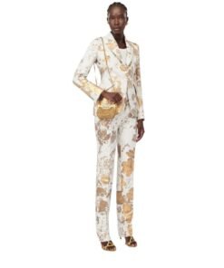 Magnetic fastening, fixed chain strap. Brass hardware with antique gold finishing. Contrasting suede-effect lining.