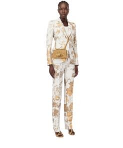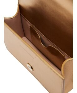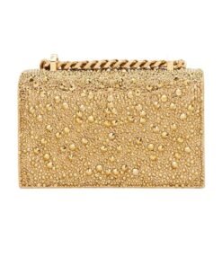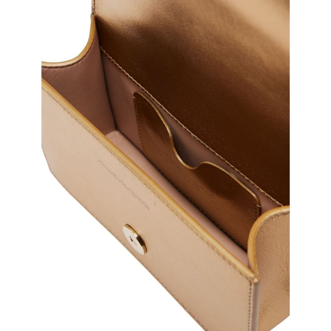 Dimensions: Length 17.5 x Height 9.5 x Depth 4 cm (6.7 x 3.7 x 1.5 inches). This Alexander Mcqueen Womens The Mini Jewelled Satchel In Gold features a gold four-ring embellishment adorned with crystals, adding a touch of luxury. It has one main compartment and a card slot for organizing your essentials. The adjustable leather and chain strap allows for versatile carrying options, while the brass hardware with antique gold finishing enhances its sophisticated look. The blush leather lining provides a soft and stylish interior.