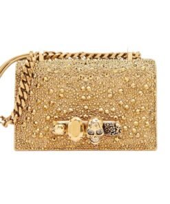 Dimensions: Length 17.5 x Height 9.5 x Depth 4 cm (6.7 x 3.7 x 1.5 inches). This Alexander Mcqueen Womens The Mini Jewelled Satchel In Gold features a gold four-ring embellishment adorned with crystals, adding a touch of luxury. It has one main compartment and a card slot for organizing your essentials. The adjustable leather and chain strap allows for versatile carrying options, while the brass hardware with antique gold finishing enhances its sophisticated look. The blush leather lining provides a soft and stylish interior.