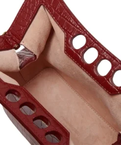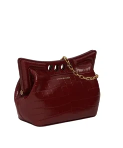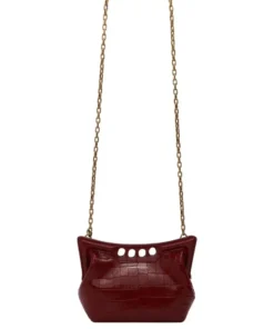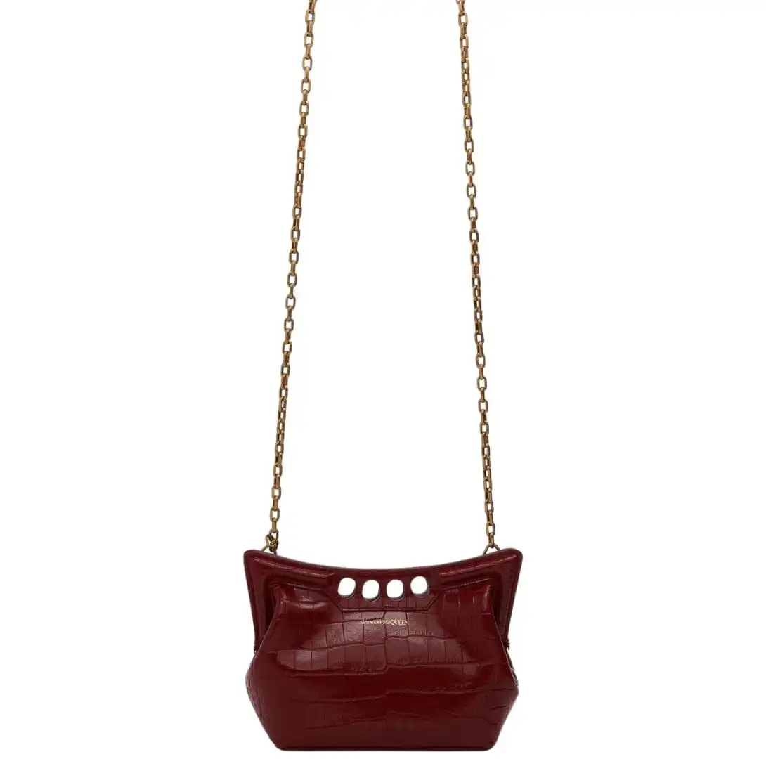 Inspired by the sharp and structured shoulders of tailoring silhouettes, this Alexander McQueen women’s the peak mini with chain in Dark red bag combines a curve-shaped magnetic frame with a soft body. Handcrafted from a black croc-effect vegan material, it offers quality and durability. The Peak bag can be worn over the shoulder or across the body with its antique gold-finished chain strap.