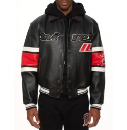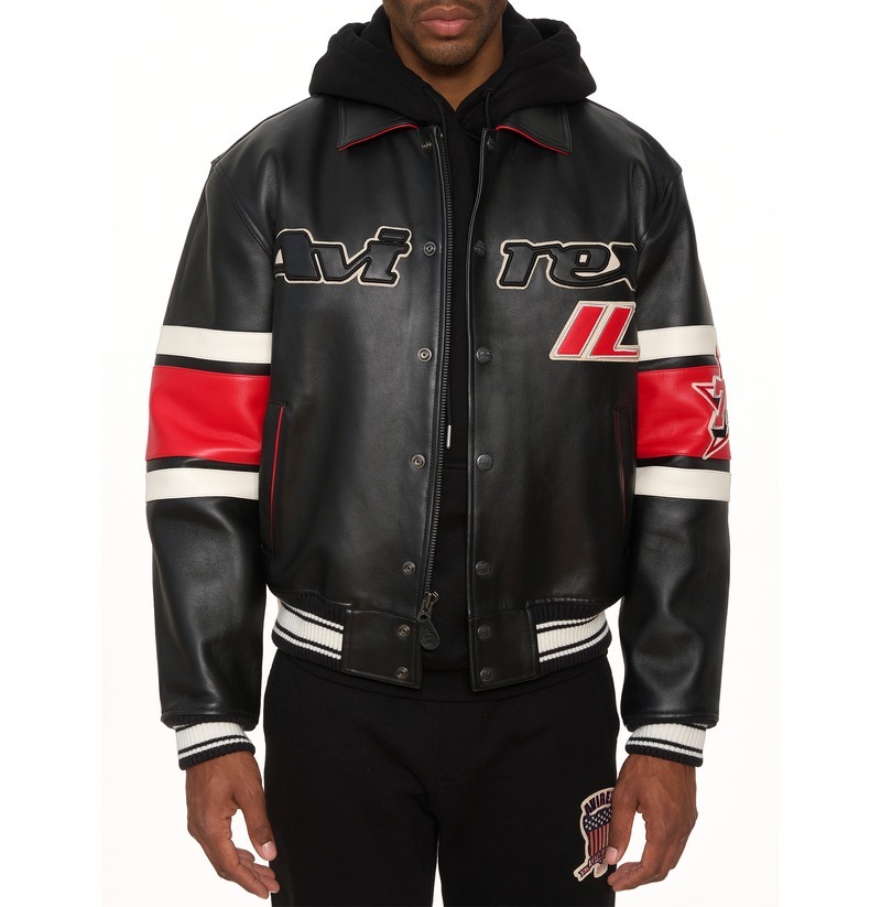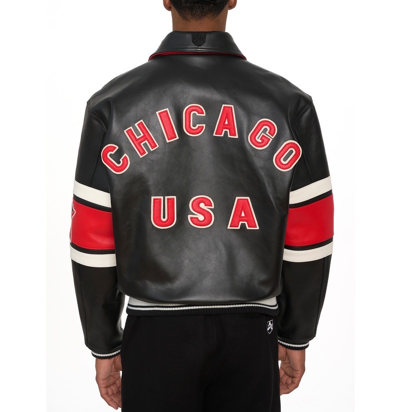 Limited Edition: Avirex jacket in 100% antique European lamb leather with Chicago, IL art patch set and applique lining art. Wide stripe detailing on sleeves.