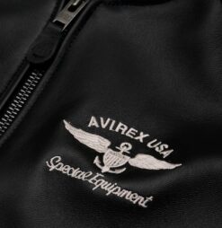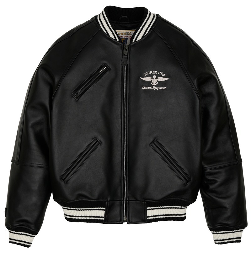 Avirex varsity jacket in 100% antique European lamb leather. Features Avirex embroidery on the front chest and Avirex USA applique and embroidered art patch set on the back.