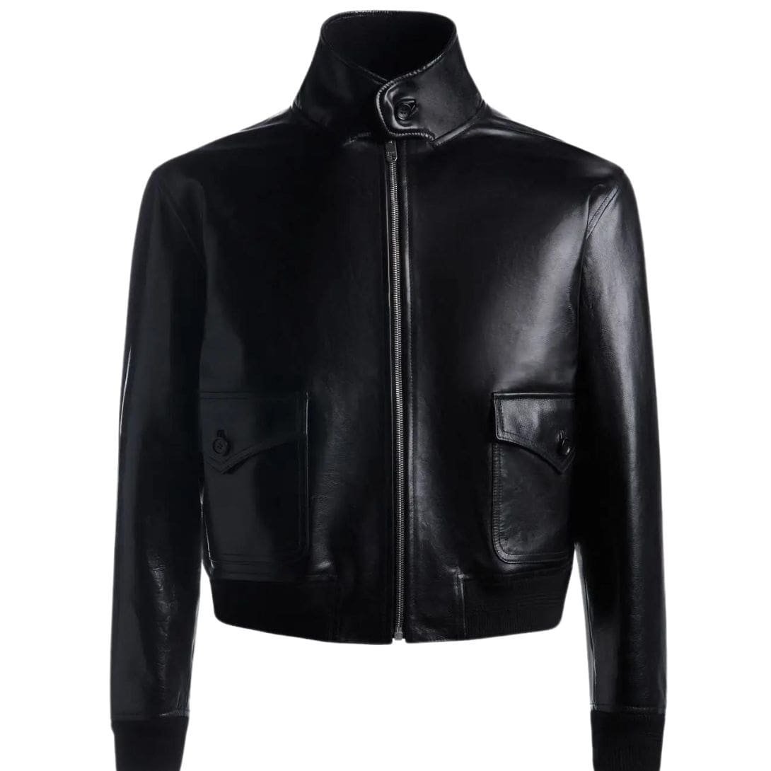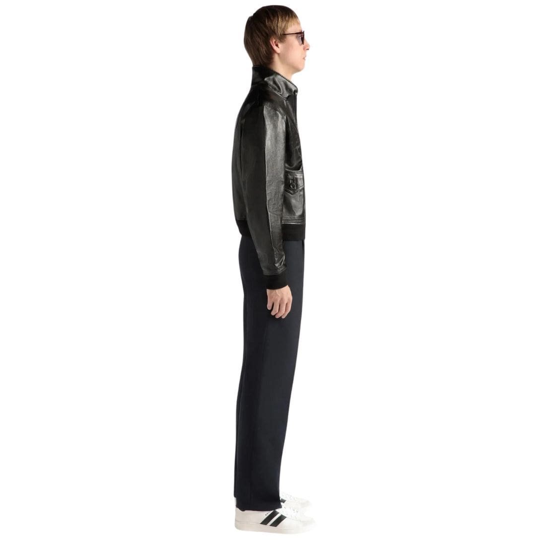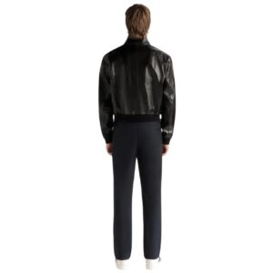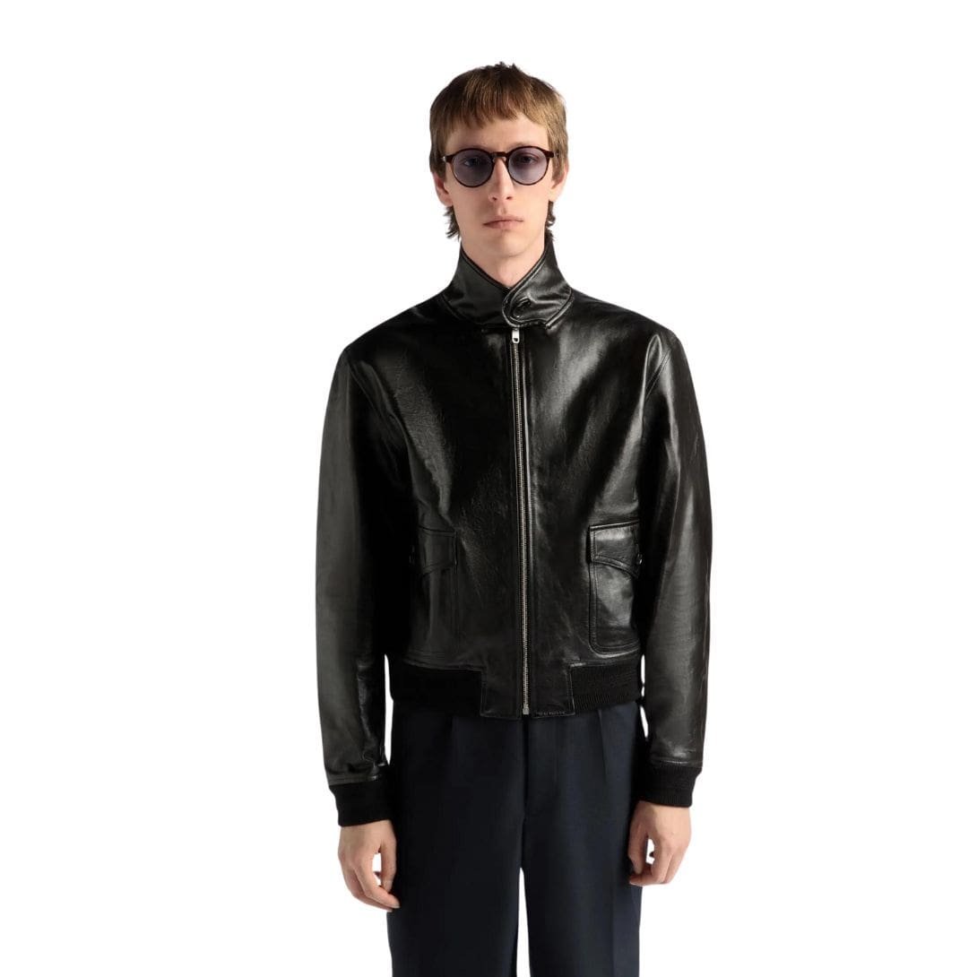 Constructed from supple black leather, the blouson exudes a sense of effortless cool, its sleek silhouette accentuated by the natural sheen of the high-quality material. The buttery texture of the leather lends a tactile richness to the garment, inviting touch and promising comfort from the moment it’s worn.