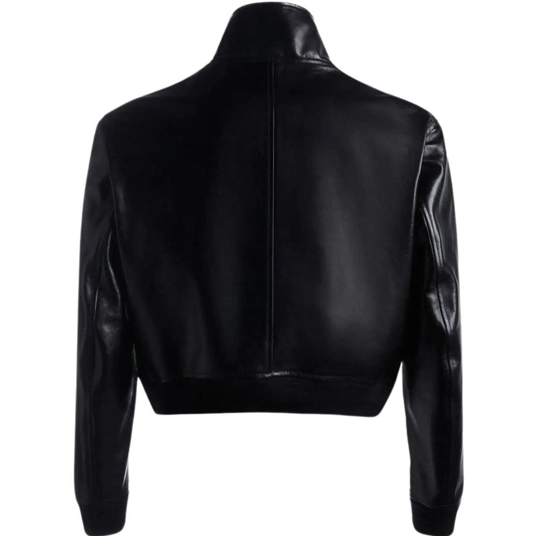 The design features a classic blouson style, characterized by its relaxed fit and elasticized hem and cuffs. This silhouette offers versatility, easily transitioning from casual outings to more formal occasions. The minimalist aesthetic is enhanced by thoughtful details, such as discreet tonal stitching and sleek silver hardware, which add a touch of understated luxury.