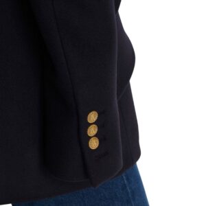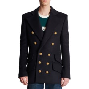 Embellishments play a significant role in defining the Balmain Short Military Style Coat. Intricate gold-tone hardware, including embossed buttons and decorative epaulettes, add a touch of opulence and refinement to the design. These embellishments not only contribute to the coat’s visual appeal but also pay homage to Balmain’s signature aesthetic, characterized by its bold and extravagant detailing.