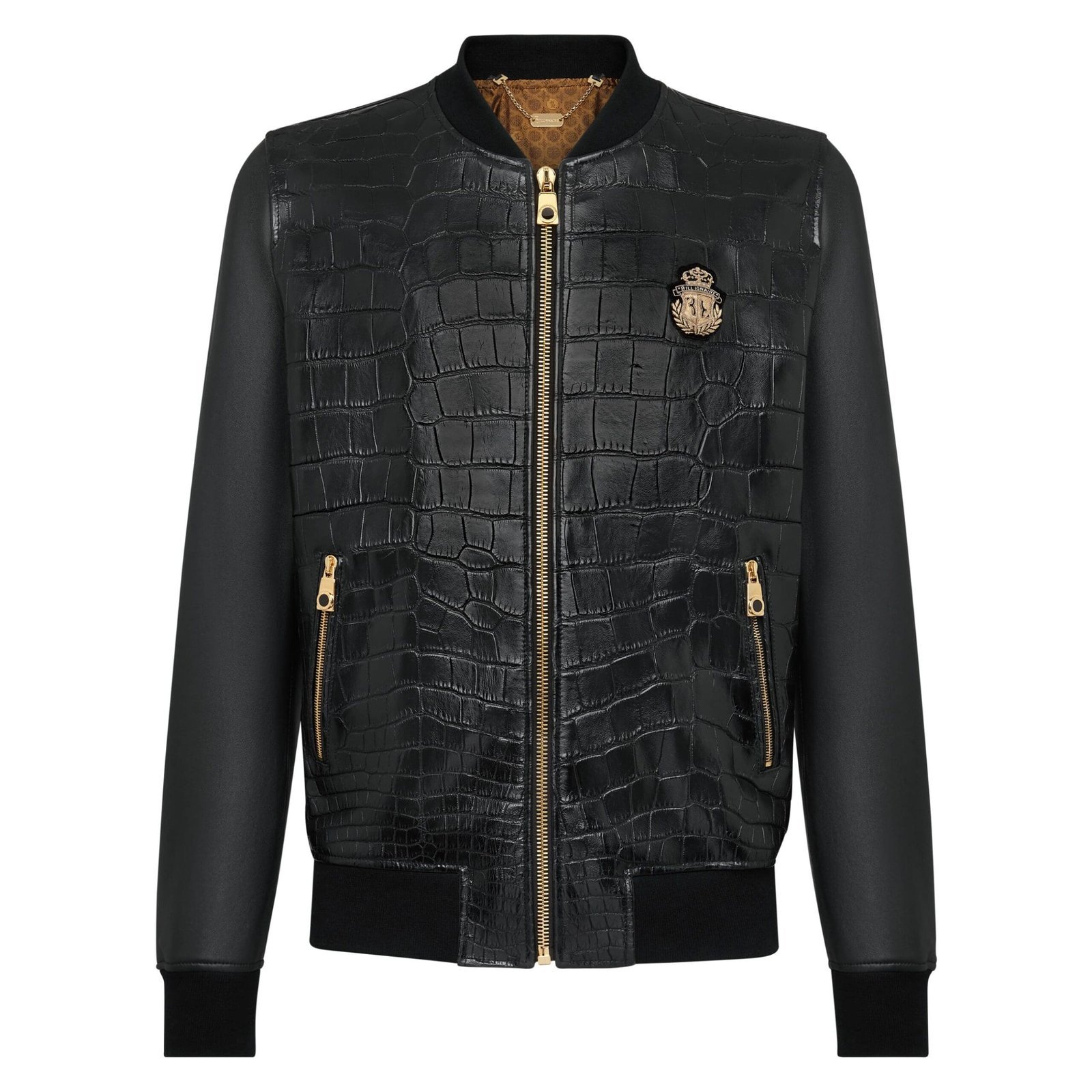 Elevating the classic billionaire leather bomber luxury jacket, traditionally associated with the U.S. Air Forces, luxury meets tradition with this stunning rendition crafted from crocodile skin and Nappa leather. Featuring zipper fastening and zip-up pockets, it seamlessly combines functionality with opulence.