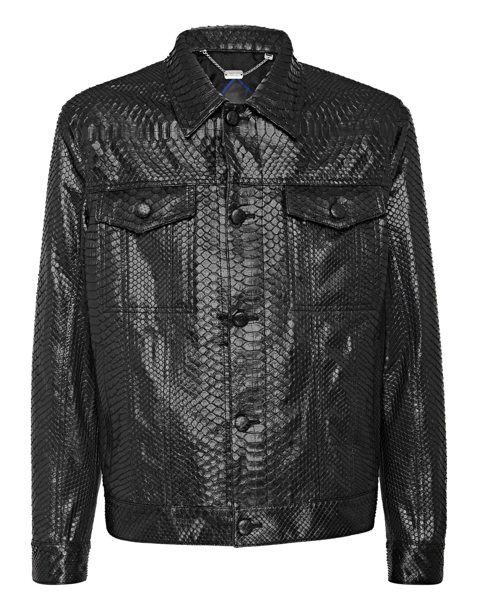 The Billionaire Leather jacket Luxury, typically crafted from denim, undergoes a remarkable transformation into a sophisticated luxury garment crafted from python skin. The buttons adorning the fastening are meticulously lined with the same exquisite material, which is also elegantly featured on the two patch pockets with flaps, the cuffs, and the bottom hem.