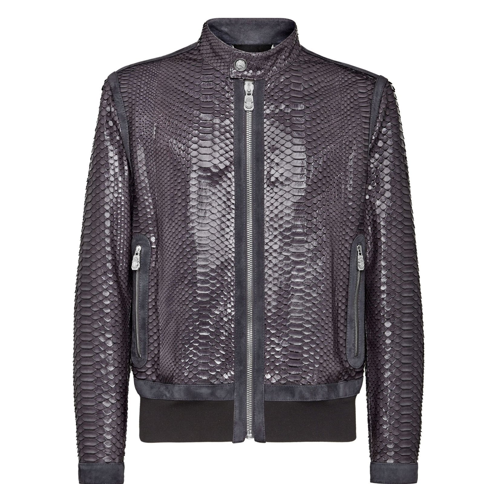 A billionaire leather jacket luxury, stylish Python skin jacket accentuated with suede details. Features include a zipper fastening and a press stud band collar for a sophisticated touch. It boasts two zip-up pockets and zipped cuffs for added convenience.