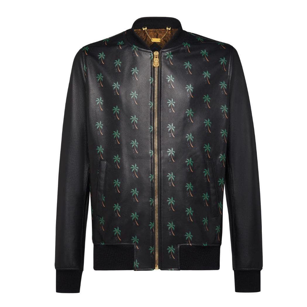 The billionaire leather palms tree takes center stage as one of the main themes this season. Embracing this motif, this nappa bomber jacket features an all-over palm tree print on both the front and back. Secured with a zipper fastening, it includes two slit pockets for convenience. A metal emblem adorns the hanging loop at the yoke, adding a touch of sophistication. Complete with a ribbed collar, cuffs, and bottom hem, this jacket is finished with an inner lining for added comfort.