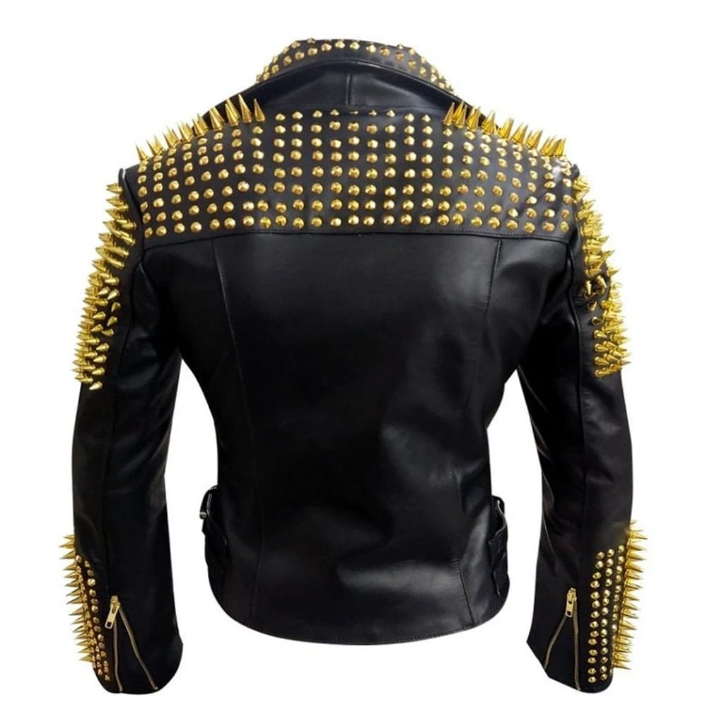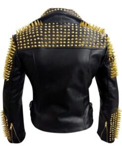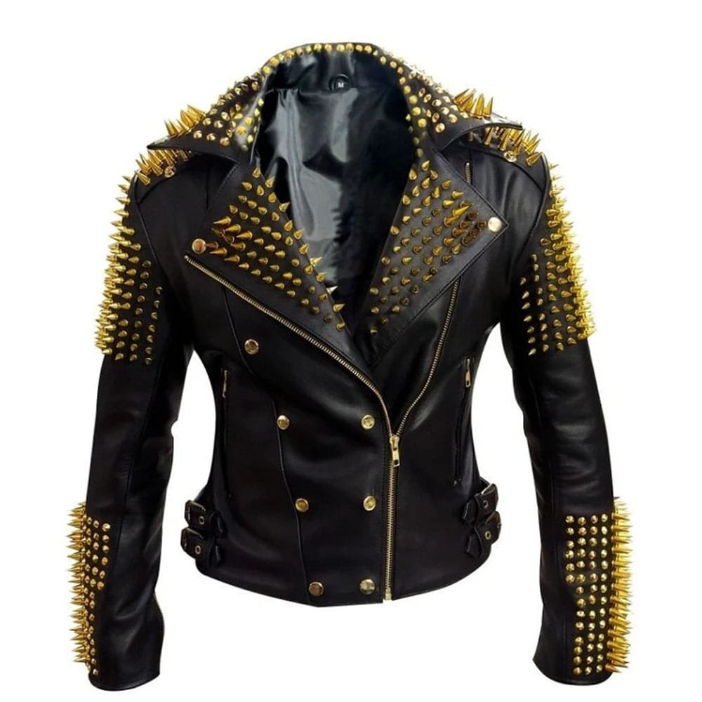 Black Heavy Metal Gold Studs Motorbike Leather Jacket Women
