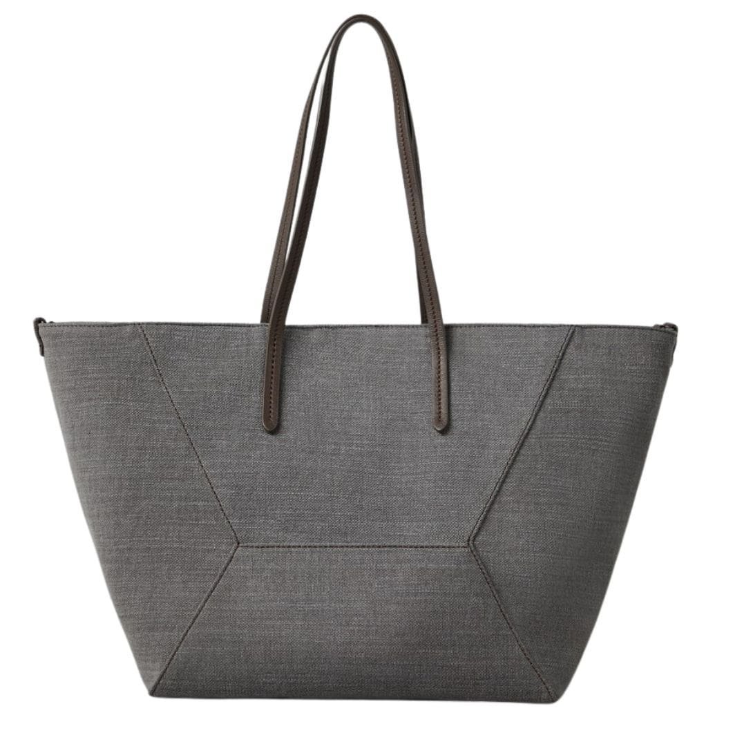 Description: Refined materials and artisanal craftsmanship imbue this Brunello Cucinelli Cotton And Linen Canvas shopper bag with Monili a summery sophistication. The “raw” texture of the cotton and linen canvas fabric offers a dry, slightly mottled appearance, contrasting with the smooth leather used for the wide handles, ensuring easy carrying. Two small Monili details on the sides complete the design. When fastened, two internal ties allow the bag’s shape to be modified for a more compact form.