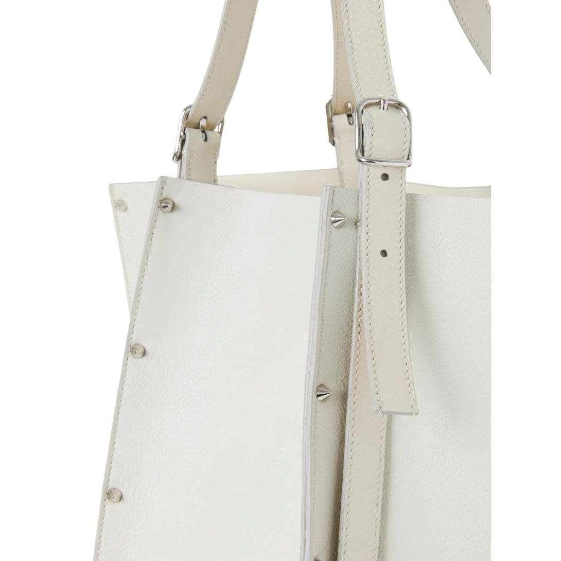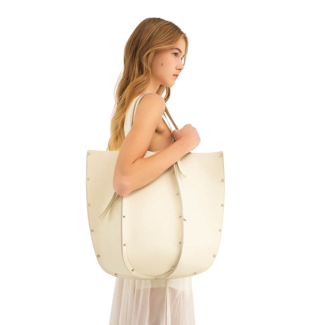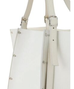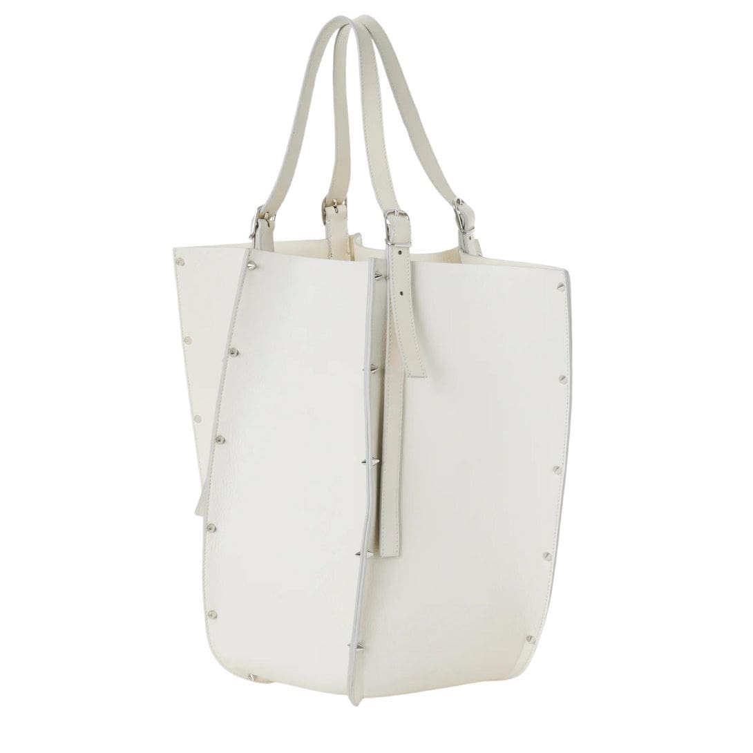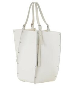 Step into the realm of timeless sophistication with the large CHLOE Carmela Tote Bag White, a captivating fusion of modern design and luxurious craftsmanship. Crafted from exquisite-grained bull skin, this statement accessory exudes an aura of understated elegance, elevated by the line’s signature spike studs that adorn its exterior, effortlessly catching and reflecting the light with every movement.