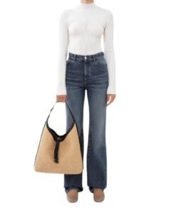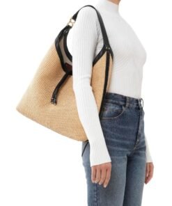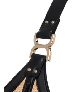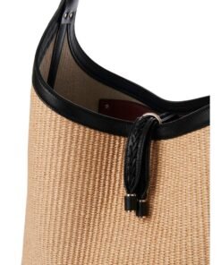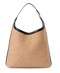 Crafted with meticulous attention to detail, the Marcie hobo bag is a tactile masterpiece, weaving together a textural interplay of raffia and supple calfskin. Its artisanal charm is accentuated by the presence of the line’s signature metallic piece adorning the leather handle, a nod to its heritage and craftsmanship.