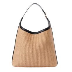 Crafted with meticulous attention to detail, the Marcie hobo bag is a tactile masterpiece, weaving together a textural interplay of raffia and supple calfskin. Its artisanal charm is accentuated by the presence of the line’s signature metallic piece adorning the leather handle, a nod to its heritage and craftsmanship.