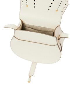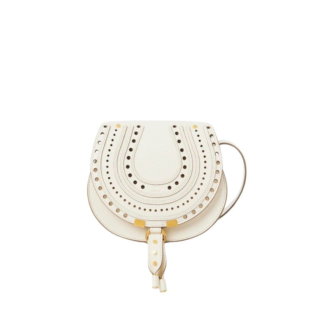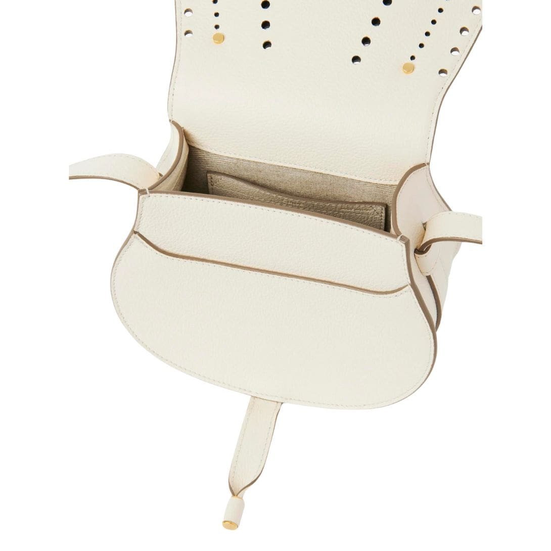 Crafted with meticulous attention to detail, the CHLOE Marcie Small Saddle Bag Misty Ivory represents a harmonious fusion of timeless elegance and contemporary flair. Rooted in the Chloé DNA, this exquisite accessory is crafted from perforated-grained calfskin, showcasing the Maison’s commitment to quality craftsmanship and innovative design. The juxtaposition of a clean top line and round silhouette reflects Maison’s distinctive play on masculine and feminine elements, epitomizing its unique blend of sophistication and charm.
