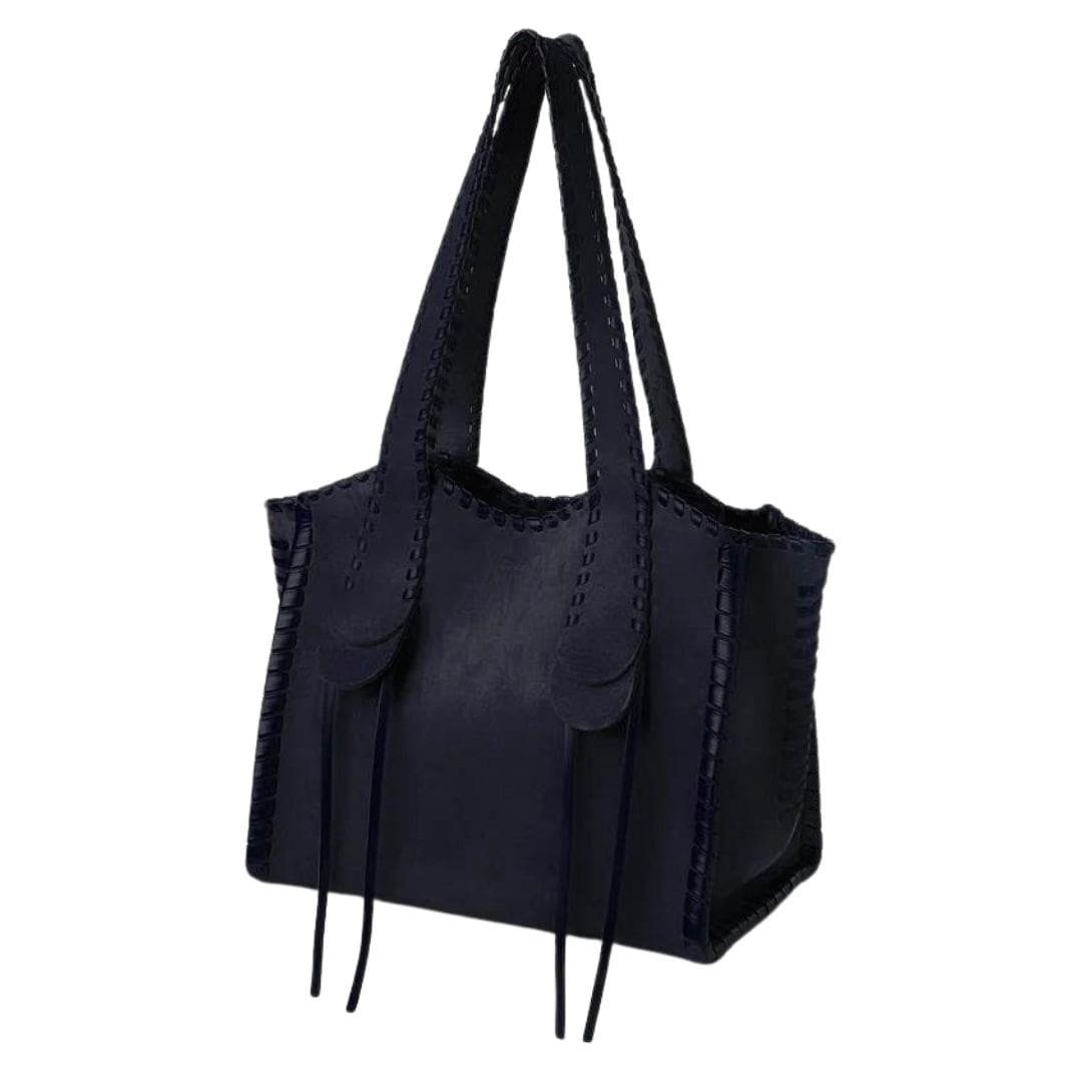 The spacious main compartment, complemented by a flat pocket stitched inside, provides ample space for all your essentials, ensuring organization without compromising on style. Dangling leather links adorn the layered handles, adding a touch of artisanal flair to this versatile all-leather tote bag.