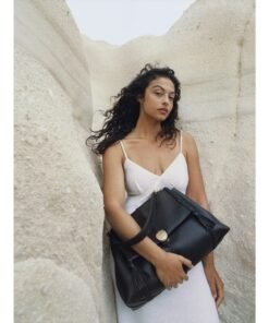 The spacious interior of the bag offers ample room for all your essentials, with a large main compartment and an internal zippered pocket for added organization. The line’s signature metallic closure, reminiscent of vintage jewelry and developed in Italy, adds a touch of sophistication and serves as a distinctive finishing touch. This closure echoes the hooks attaching the removable leather handle, creating a sense of cohesion and elegance throughout the design.