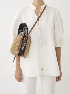 At the heart of the Woody line lies the iconic Chloe logo, delicately embroidered on contrasting webbing. This emblematic detail pays homage to the Maison’s renowned mules, infusing the basket with a subtle yet unmistakable sense of luxury.