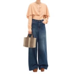 The Chloe Small Woody Tote Bag in Linen Dark Nut. is a refined blend of style and practicality, ideal for the summer season. This exquisite piece is meticulously crafted from a combination of linen canvas and shiny calfskin, offering a chic yet casual aesthetic. The bag’s design is both functional and fashionable, featuring modern lines accentuated by contrasting vertical leather strips and the iconic Chloé logo embroidery.