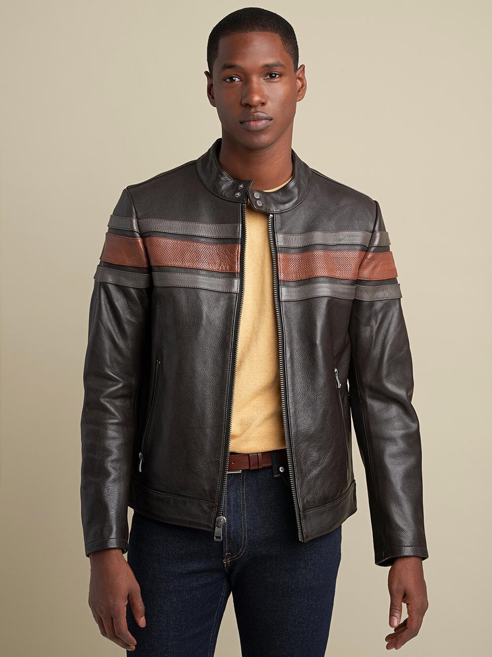Online Only – Finish your look in the ruggedly retro style of this genuine leather jacket from Wilsons Vintage, which features distressed material and a cool striped design on the chest. All our Wilsons Vintage brand jackets have an ageless attitude and a slim, modern fit. Runs one size smaller than normal.