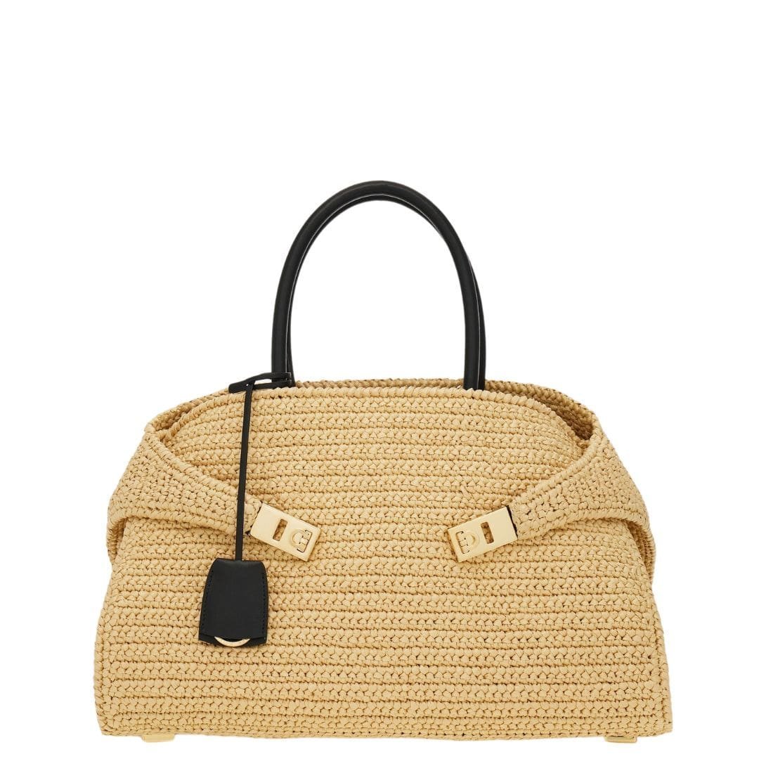In the rhythm of contemporary fashion, the Ferragamo Hug silhouette in woven raffia orchestrates a symphony of sophistication, inviting you to indulge in its harmonious blend of craftsmanship and elegance. With every glance, every touch, it whispers tales of summer escapades and timeless allure, a true embodiment of high-end luxury in every sense.