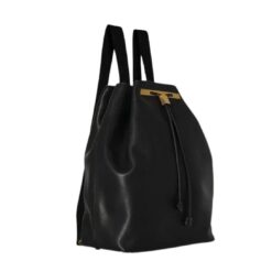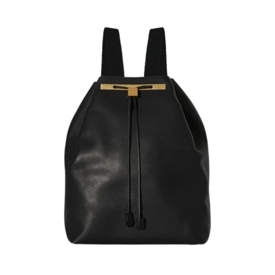 lA Garconne The Row backpack 11 in Double Black boasts an adjustable drawstring and a gold-tone metal toggle closure, all crafted from smooth saddle leather. It includes a single interior zipper pocket, adjustable shoulder straps, and metal feet for added durability.