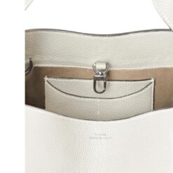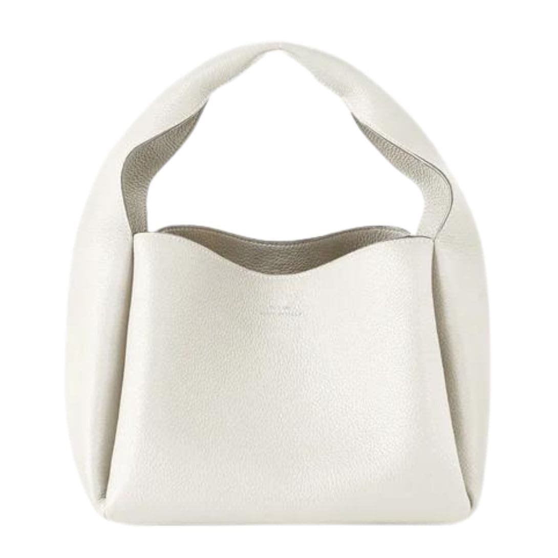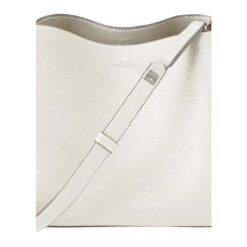 The La Garconne Totême Bucket Bag — MILK features a sculpted cubic bucket silhouette, meticulously crafted in Italy from supple pebble-grained leather. It offers versatile carrying options with a folded handle and a detachable, adjustable strap. The bag opens with an internal clasp to reveal a beige microsuede lining, complete with a card slot and phone pocket. It is accented with silver-tone metal hardware and contrast stitching, including a subtle T at the top edge.