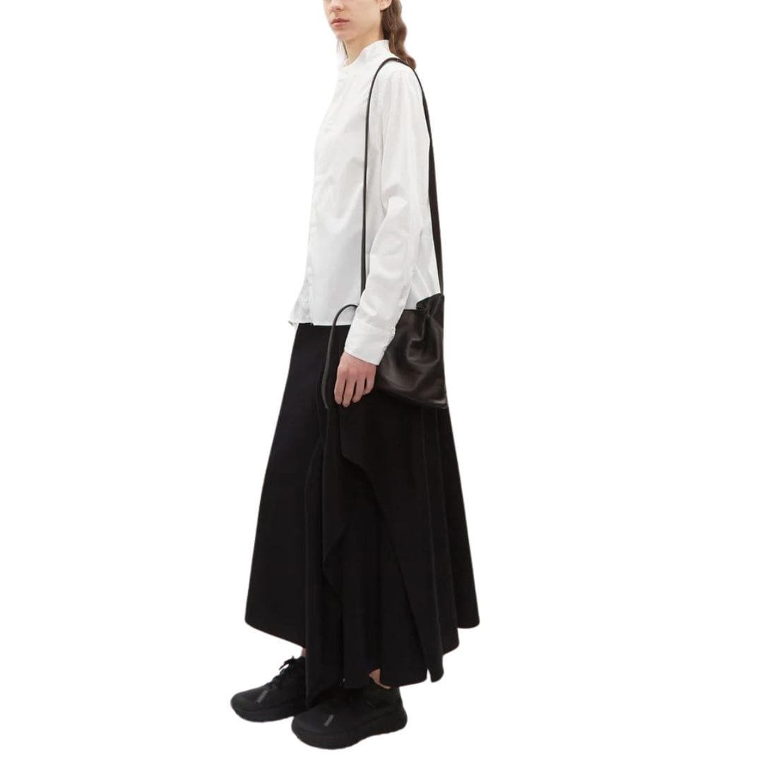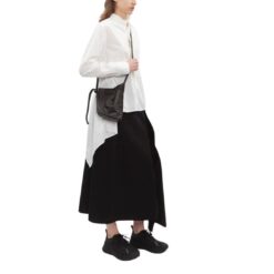 La Garconne Yohji Yamamoto Folding Leather Pouch asymmetrical pouch bag is crafted from soft leather, featuring an adjustable shoulder strap and snap button closure. It is adorned with black-tone metal hardware.