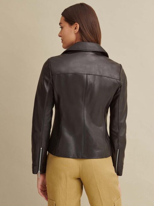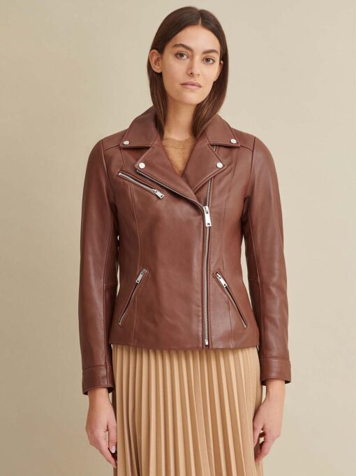 An asymmetrical zipper and tons of metallic details lend an edgy style to this ultra-chic genuine leather jacket.