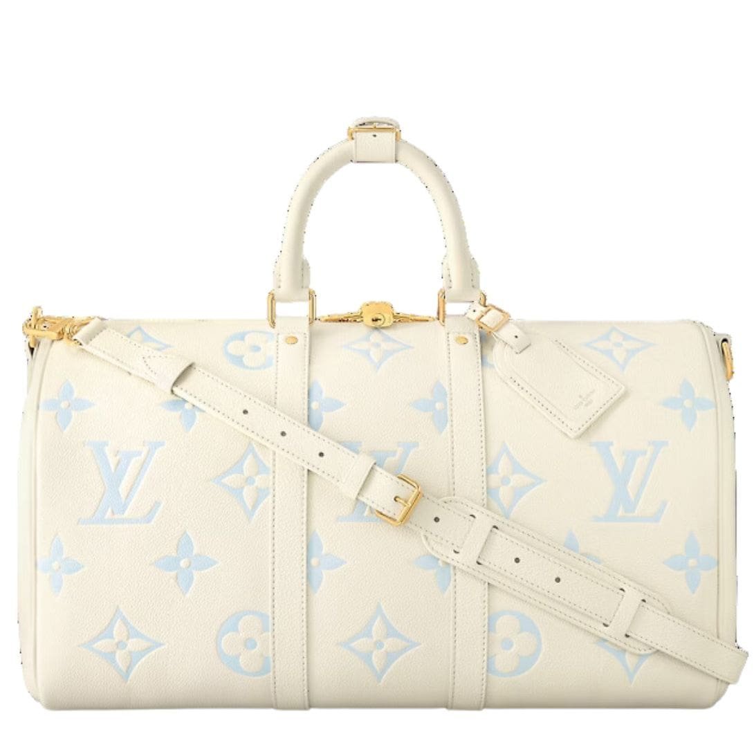 Introducing the ultra-feminine iteration of the LOUIS VUITTON KEEPALL BANDOULIERE 45 from the Milky Way capsule collection, a captivating blend of delicate allure and practical sophistication. This Louis Vuitton classic receives a modern update with supple-grained cowhide leather embossed with the House’s signature Monogram pattern, presented in a trendy palette of creamy colors.