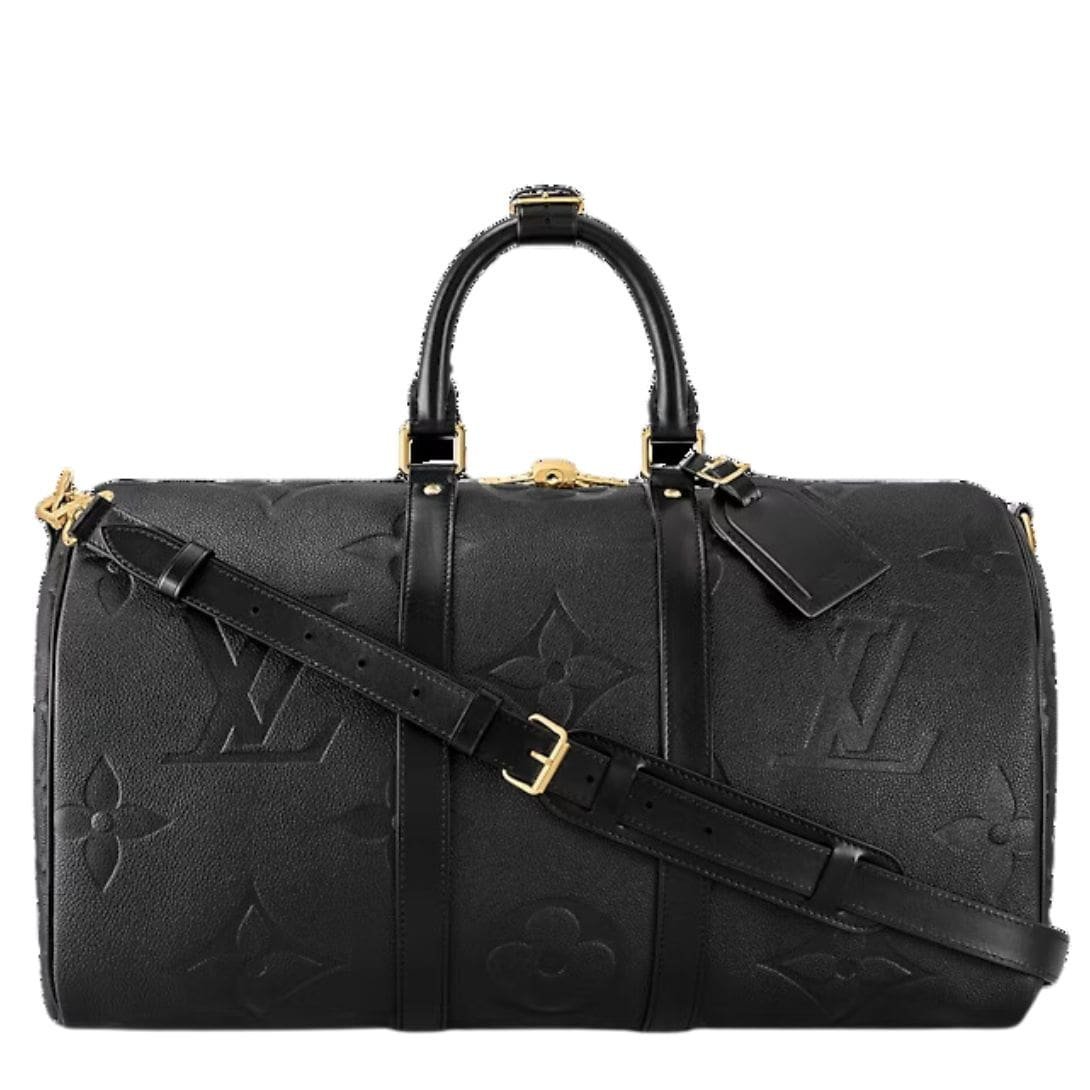 Introducing the epitome of timeless sophistication: the LOUIS VUITTON KEEPALL BANDOULIERE 45, meticulously crafted from Monogram Empreinte Giant leather, adorned with opulent gold-color hardware. This embodiment of elegance exudes an aura of understated luxury, where supple black cowhide is masterfully embossed with an oversized Monogram pattern, elevating the essence of a classic soft travel bag.