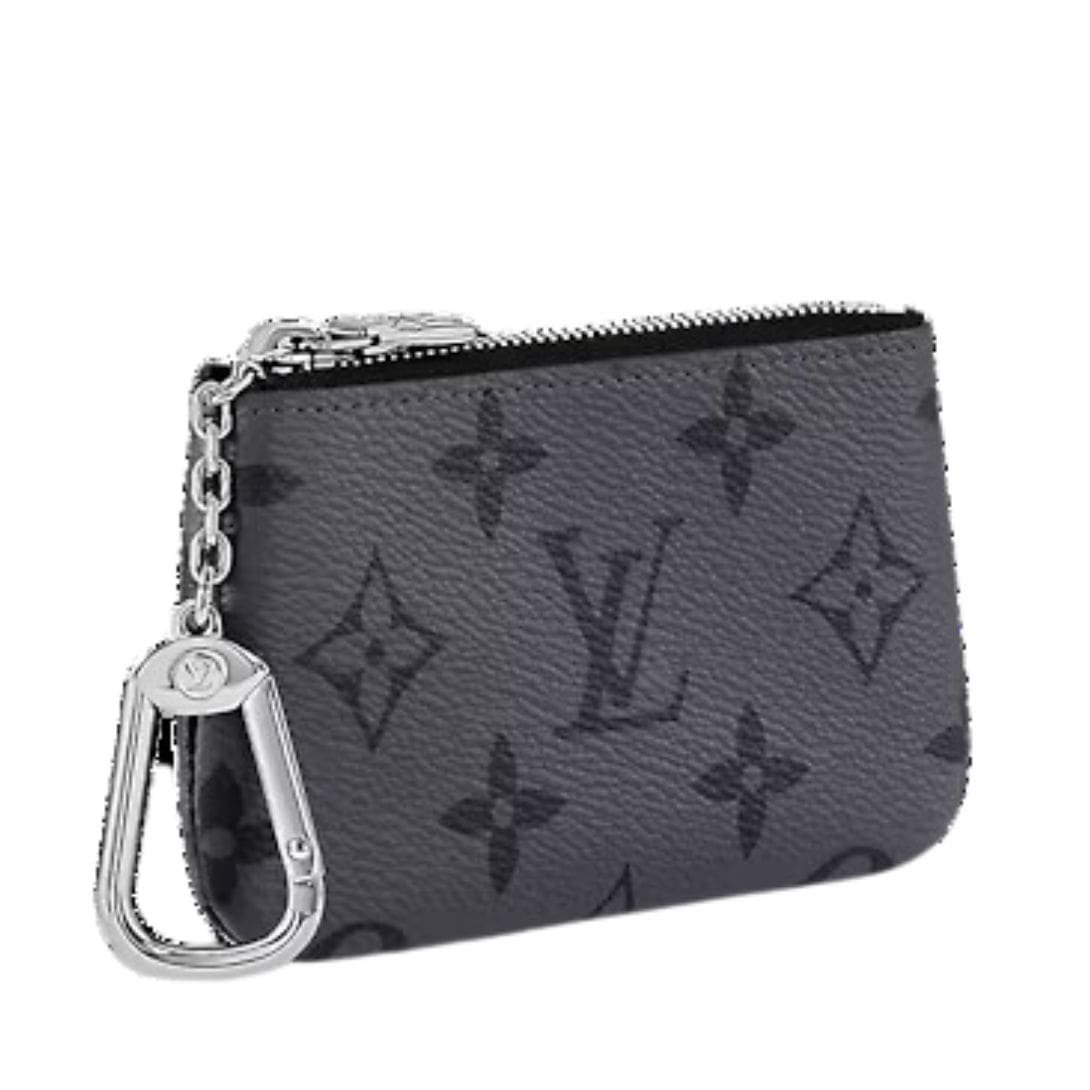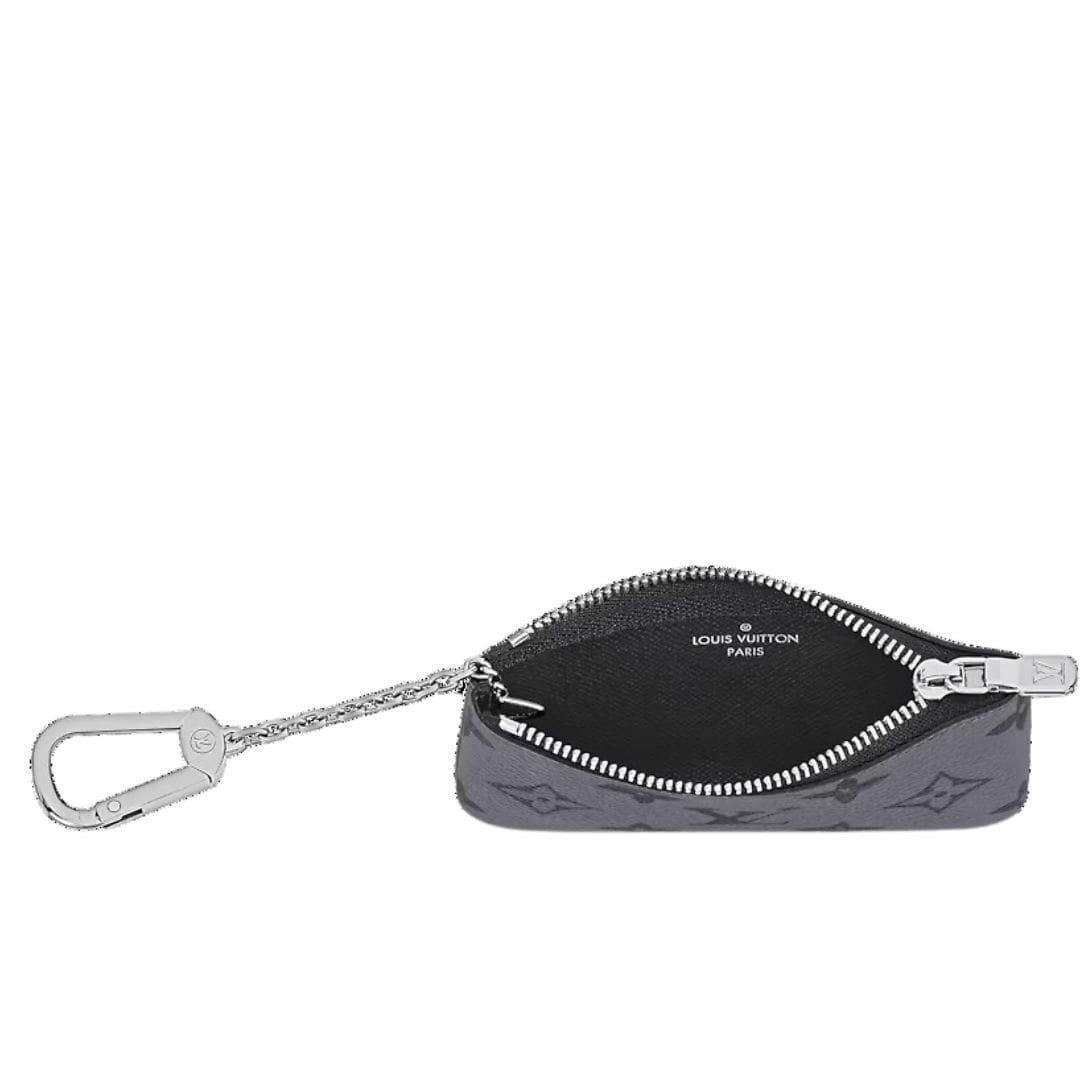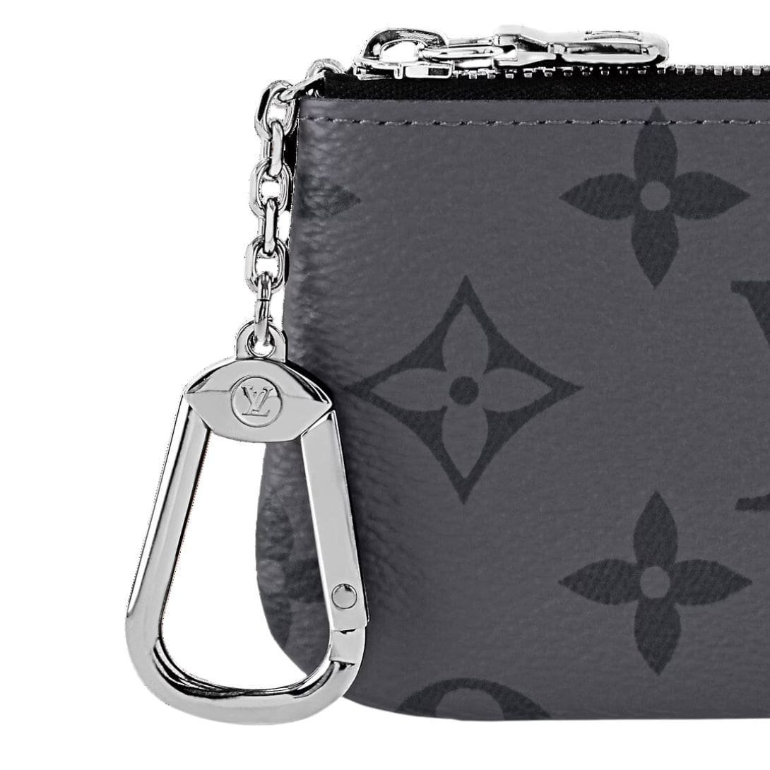Introducing the sleek and versatile LOUIS VUITTON KEY POUCH , crafted with precision from Monogram Eclipse canvas on one side and lighter Monogram Eclipse Reverse on the other. With dimensions of 4.7 x 2.8 x 0.6 inches, this compact accessory is designed to carry coins, cards, banknotes, and keys with ease. Secured with an LV-engraved zip pull, it features a convenient chain and hook, allowing you to clip it to a bag or belt for effortless access.