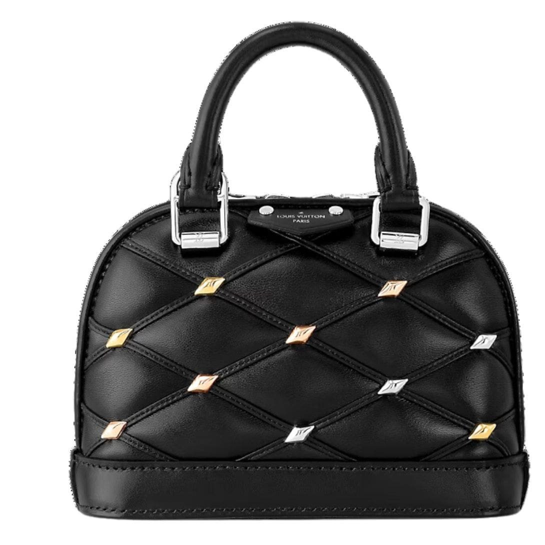 Measuring a petite 7.1 x 4.7 x 3.1 inches, the LOUIS VUITTON NANO ALMA exudes understated glamour in classic black, complemented by lambskin trim and opulent gold and silver-color hardware. The meticulous attention to detail is further enhanced by tiny studs in gold- and silver-tone metal, adding a subtle yet captivating allure to the bag.