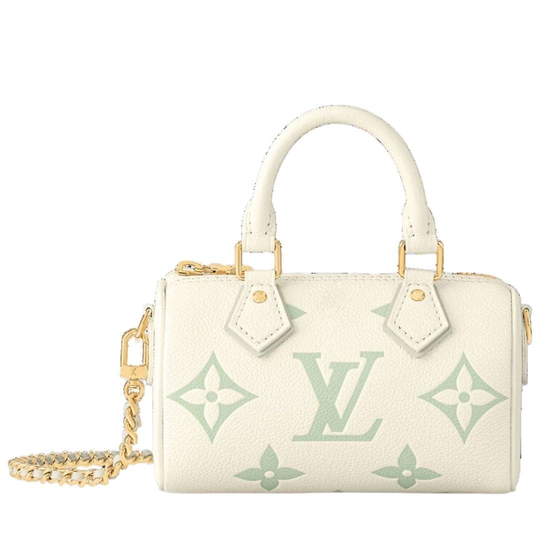 Measuring a petite 6.3 x 3.9 x 3 inches, the LOUIS VUITTON NANO SPEEDY bag boasts a charming Latte White and Matcha Green color combination, accentuating its modern allure. The grained cowhide leather exudes luxury, while the microfiber lining adds a touch of refinement to the interior.
