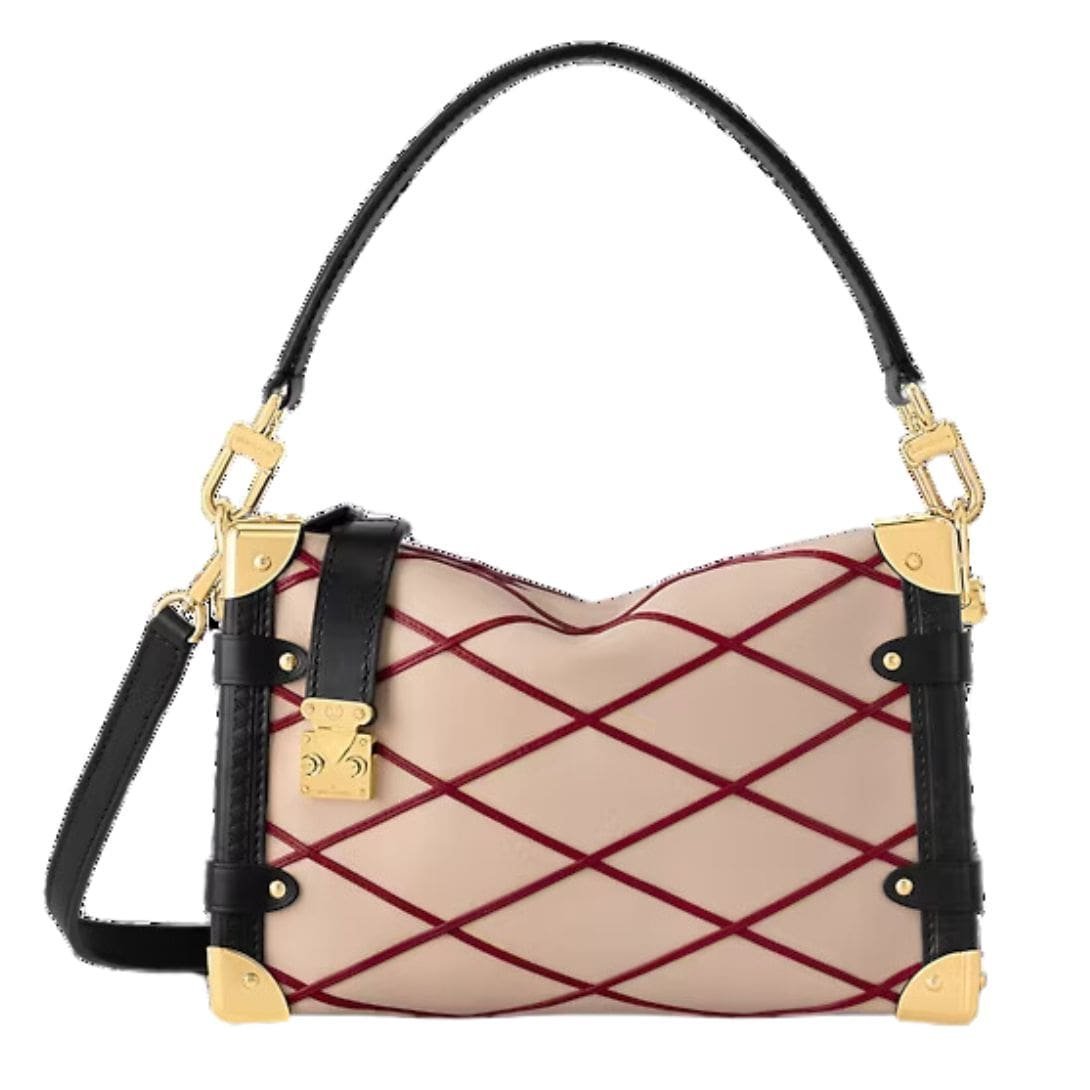 Introducing the LOUIS VUITTON SIDE TRUNK MM handbag, adorned with Maison’s signature Malletage pattern, a true testament to timeless elegance and sophistication. Crafted from soft lambskin in a beautiful beige hue crisscrossed with deep red, this exquisite piece boasts heritage-inspired touches, including a gleaming S-lock and reinforced metal corners, adding a touch of vintage charm to its modern design.