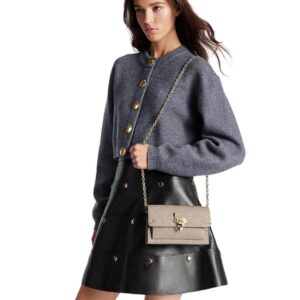 With a large gusseted compartment, a spacious flat zipped coin pocket, and an inside flat pocket, you can carry your essentials with ease. The addition of six card slots ensures you have everything you need at your fingertips. The removable chain offers versatility, allowing you to carry it as a wallet, shoulder bag, or crossbody for effortless day-to-night transitions.