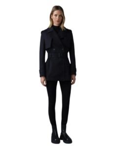 The Mackage Adva Mid-Length Buckled Belt Trench is a mid-length trench coat made from a cotton-blend twill. It features a wide notched lapel, epaulette shoulders, and rainshedder detailing for classic styling. The semi-fitted silhouette is accentuated by a removable belt and a pleated peplum, offering a touch of luxury to this timeless piece.