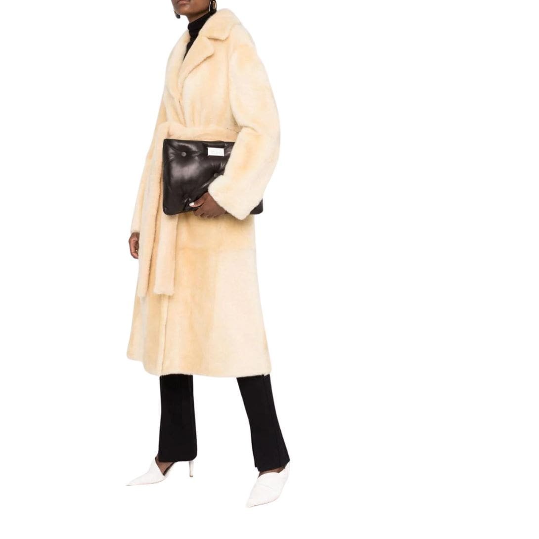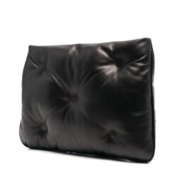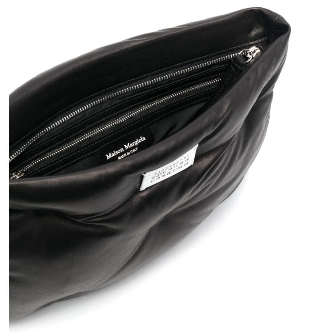 From this exquisite collection comes the Maison Margiela Glam Slam clutch bag, crafted with precision in Italy. This sleek accessory boasts a padded black leather design, elevating its elegance and versatility.