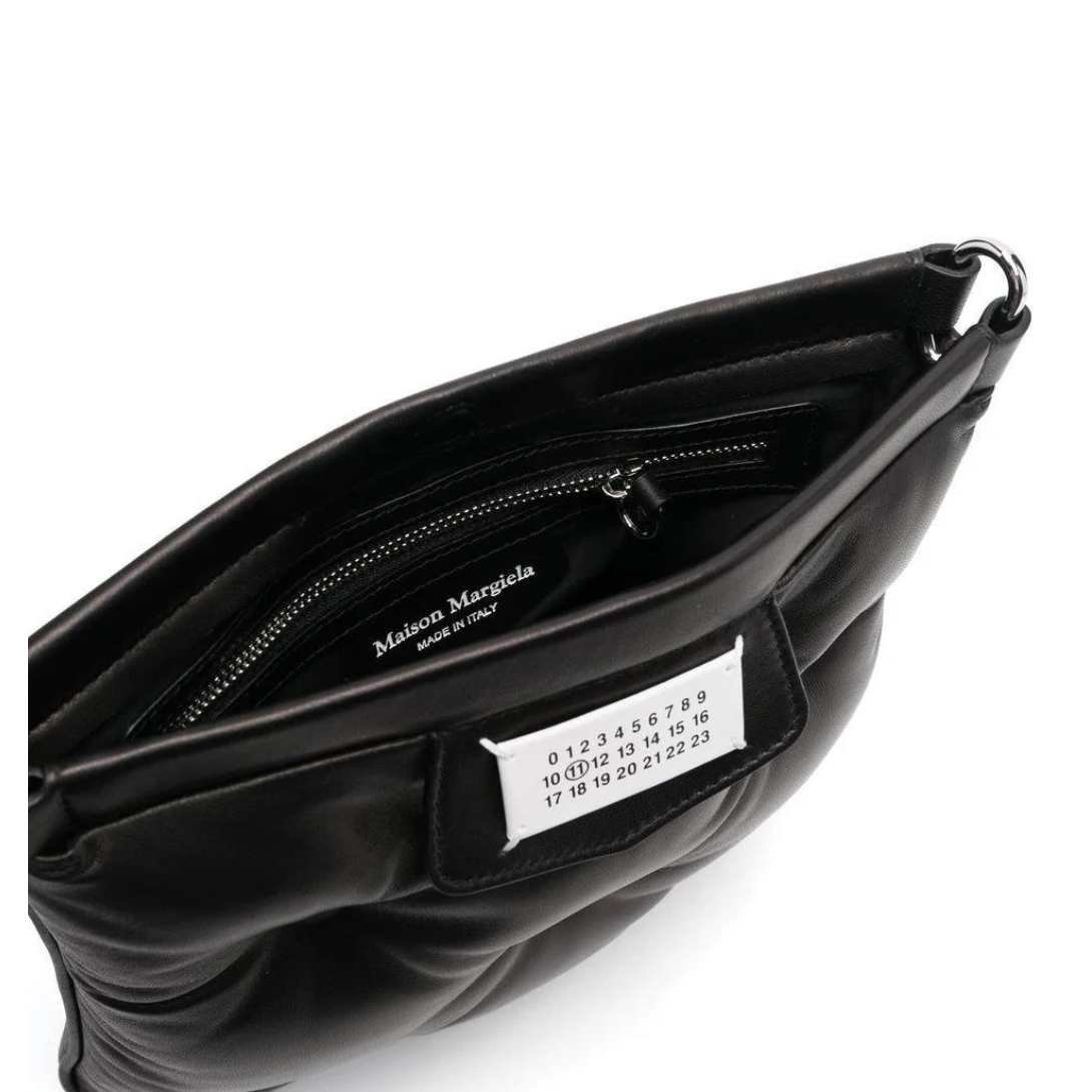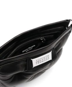 Introducing the Maison Margiela Glam Slam quilted crossbody bag, meticulously crafted in Italy to exude sophistication and versatility. This sleek accessory is crafted from jet-black calf leather, boasting a luxurious quilted finish that adds texture and depth to its design.