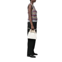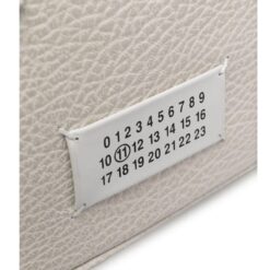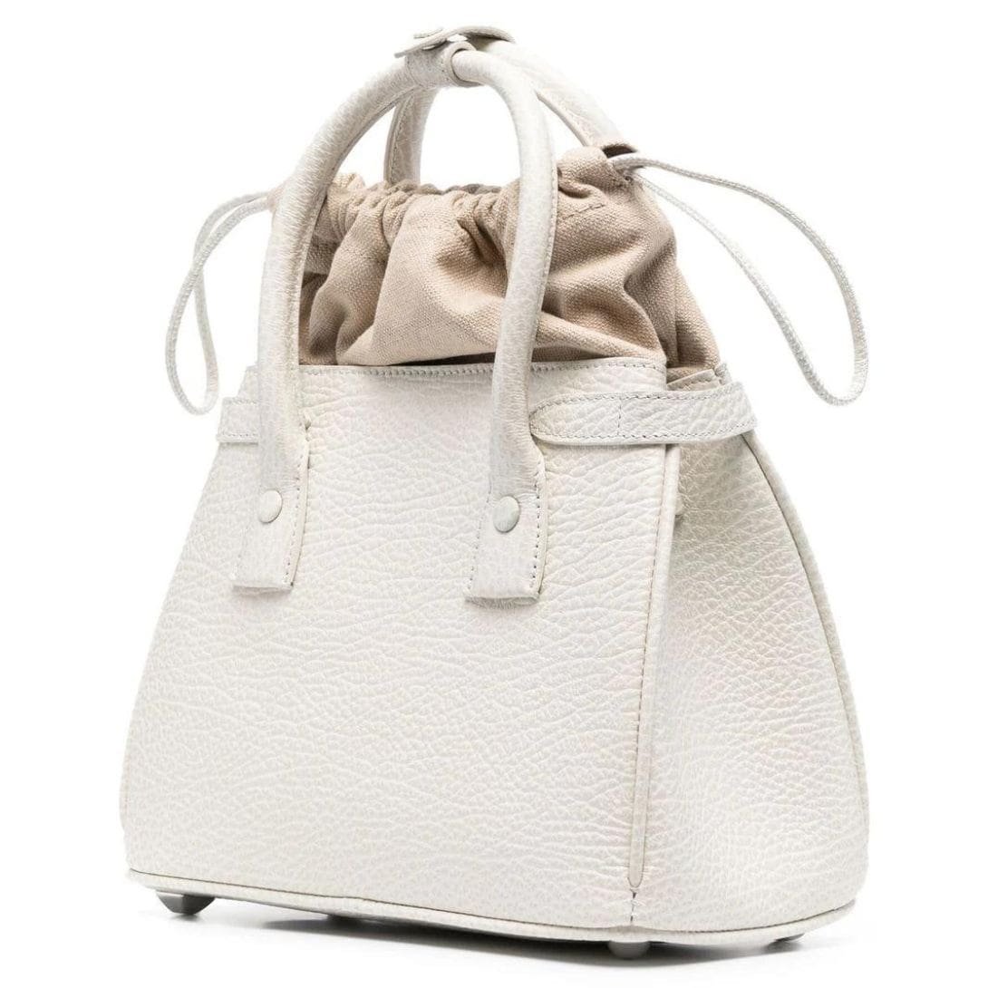 Maison Margiela Mini 5AC Drawstring Top-Handle Bag. Crafted in Italy, Maison Margiela presents the mini 5AC drawstring top-handle bag. Made from light beige calf leather with a grained texture, it features the iconic signature four-stitch logo and a logo patch on the front. The bag is adorned with decorative buckle detailing and offers versatility with an adjustable detachable shoulder strap and two top handles.